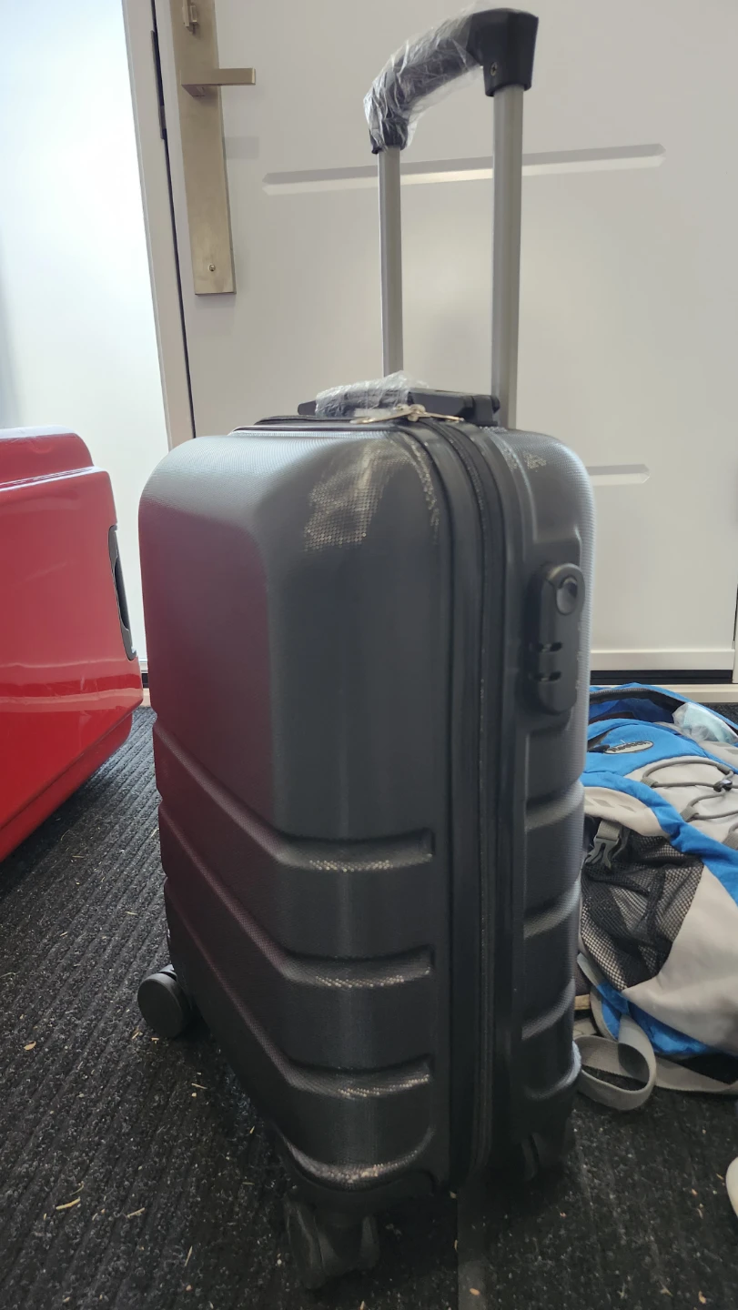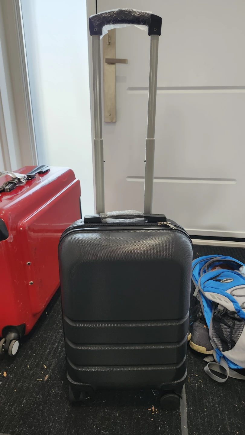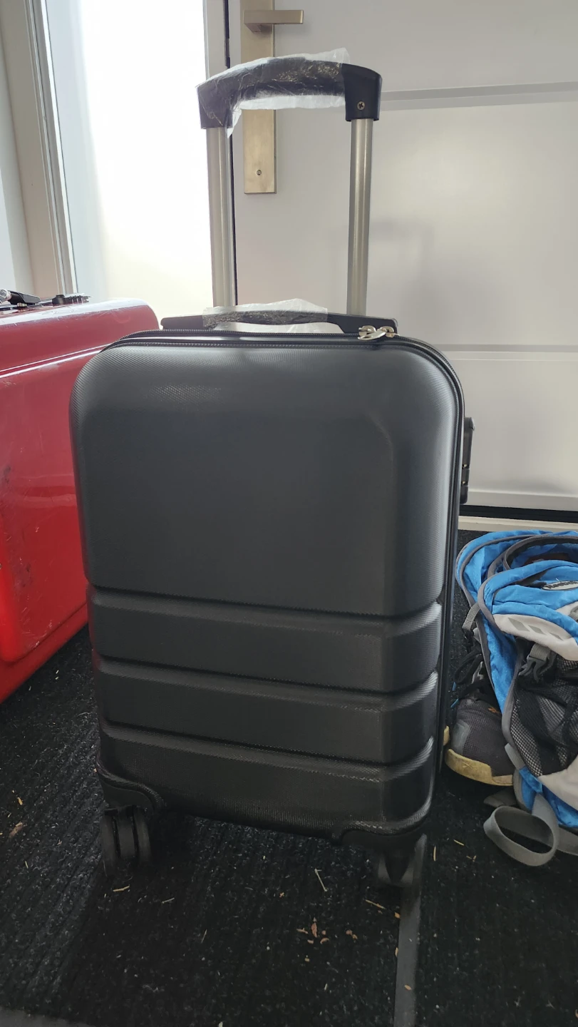 Selling a new black carry-on suitcase! It features a retractable handle and four wheels for easy maneuvering. Includes lock