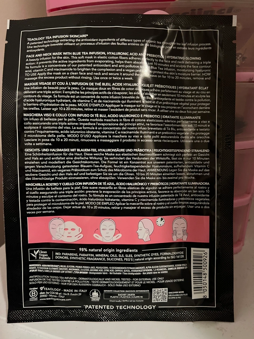 This hydrating face and neck mask uses organic blue tea infusion, hyaluronic acid, and prebiotics. It's made with 98% natural origin ingredients and a plant-based fabric. Use for 10 to 20 minutes. Great for skin hydration!