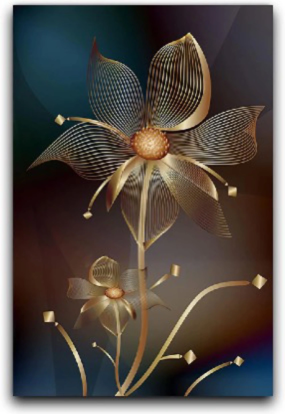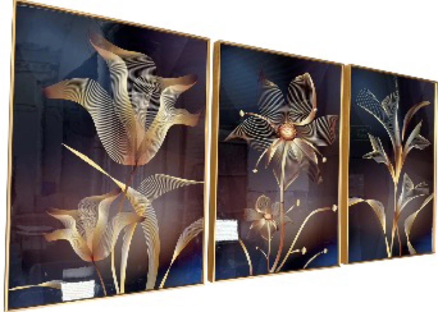 Beautiful three-piece wall art. Features gold floral designs on a dark background. Modern and elegant style. Perfect for adding a touch of sophistication to any room.