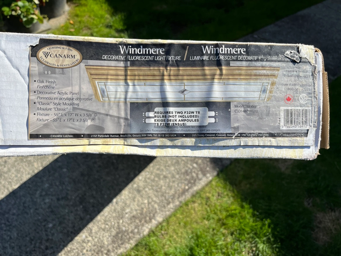 This fixture is brand new and in its original packaging. It features a handcrafted oak-finish cornice-style frame with a stained glass design on the impression panel. It measures 55 inches long x 17 inches wide x 5 inches deep. It comes with a limited lifetime warranty. It is perfect for kitchens and family rooms. It uses two T8 32W bulbs (sold separately). The model number is #052-3284-2.