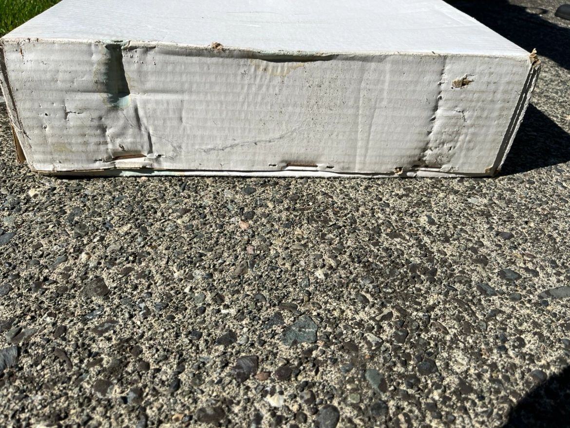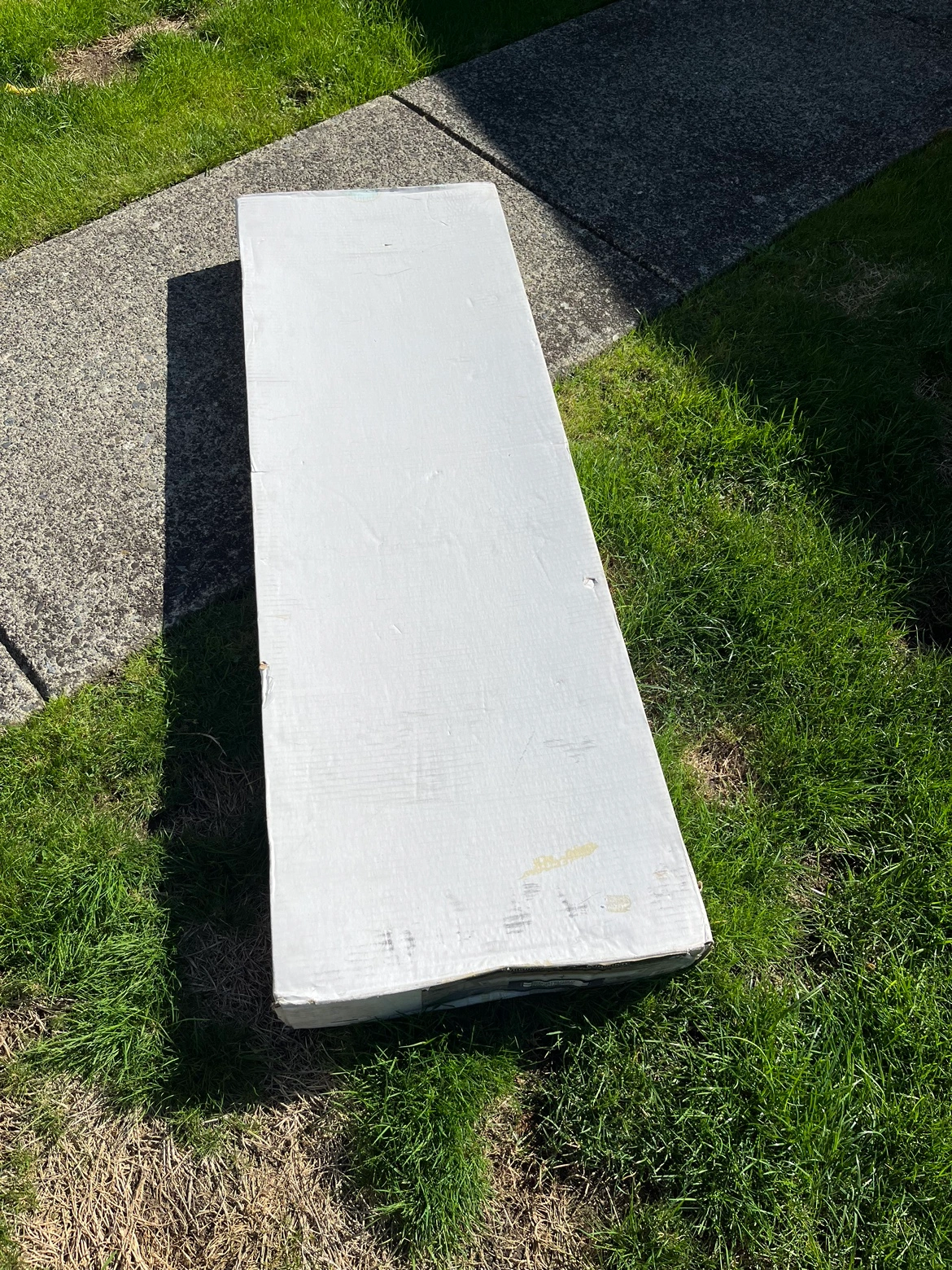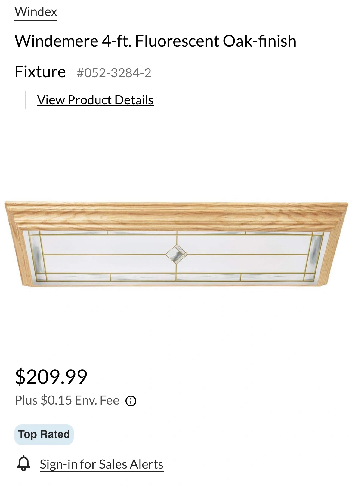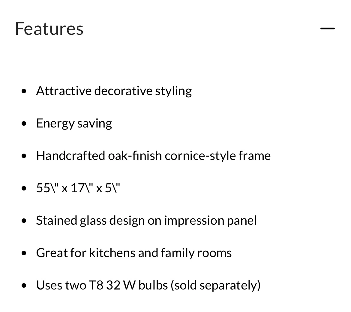 This fixture is brand new and in its original packaging. It features a handcrafted oak-finish cornice-style frame with a stained glass design on the impression panel. It measures 55 inches long x 17 inches wide x 5 inches deep. It comes with a limited lifetime warranty. It is perfect for kitchens and family rooms. It uses two T8 32W bulbs (sold separately). The model number is #052-3284-2.