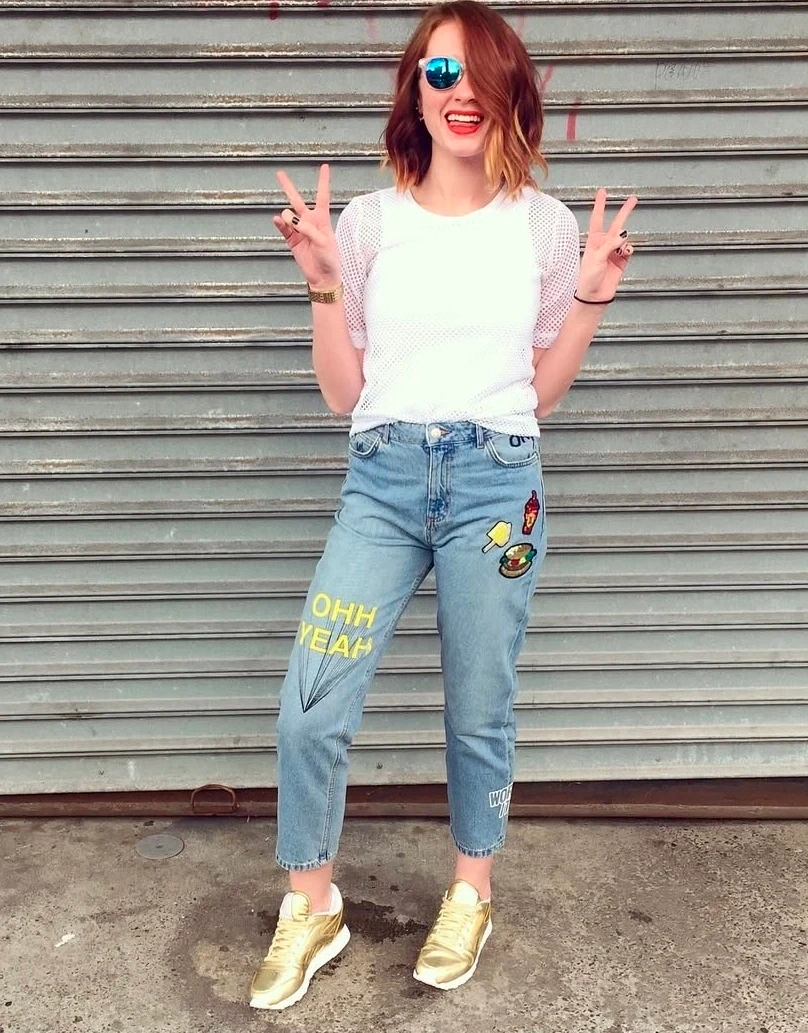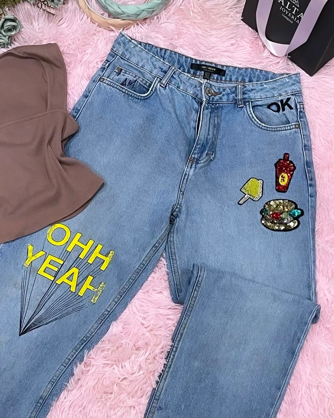 Zara light wash denim jeans with a "OHH YEAH" graphic and sequined patches of a popsicle, soda, and burger. These jeans have a comfortable, relaxed fit.
