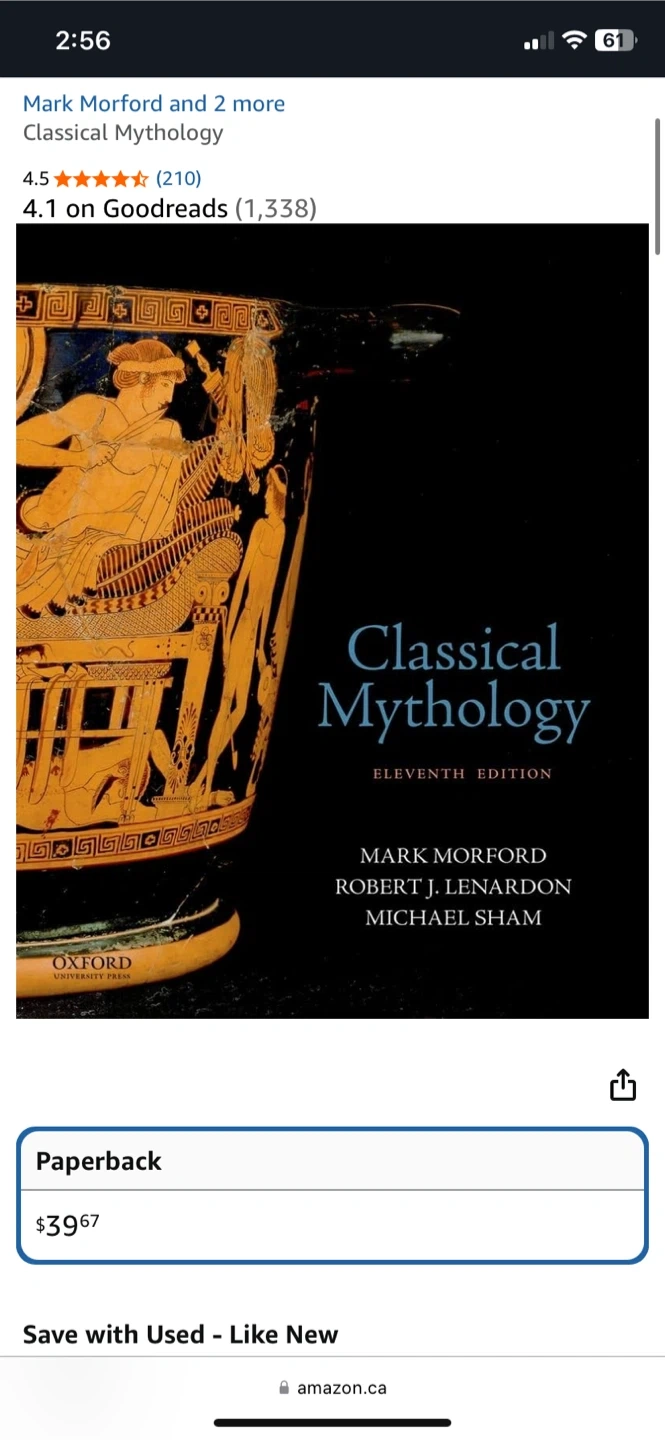 This is the Eleventh Edition of Classical Mythology by Mark Morford, Robert J. Lenardon, and Michael Sham. It covers the myths and legends of Greece and Rome. A comprehensive, classic text that brings to life the myths and legends of Greece and Rome for classical mythology.