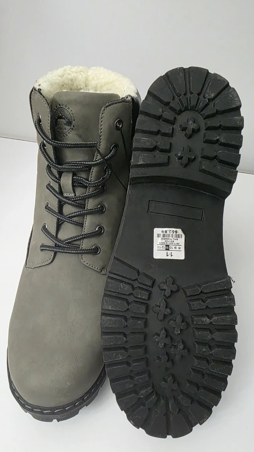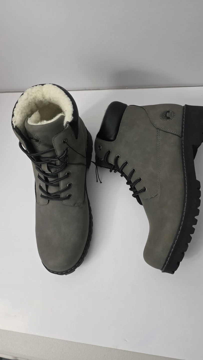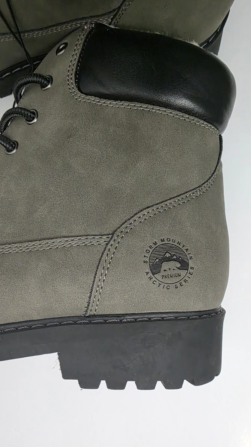 Warm winter boots from Wind River. They're grey with a faux leather exterior and cozy sherpa lining. The lug sole provides good traction.