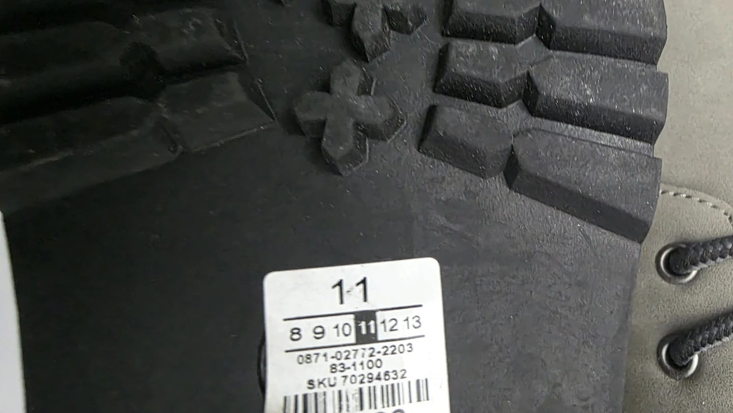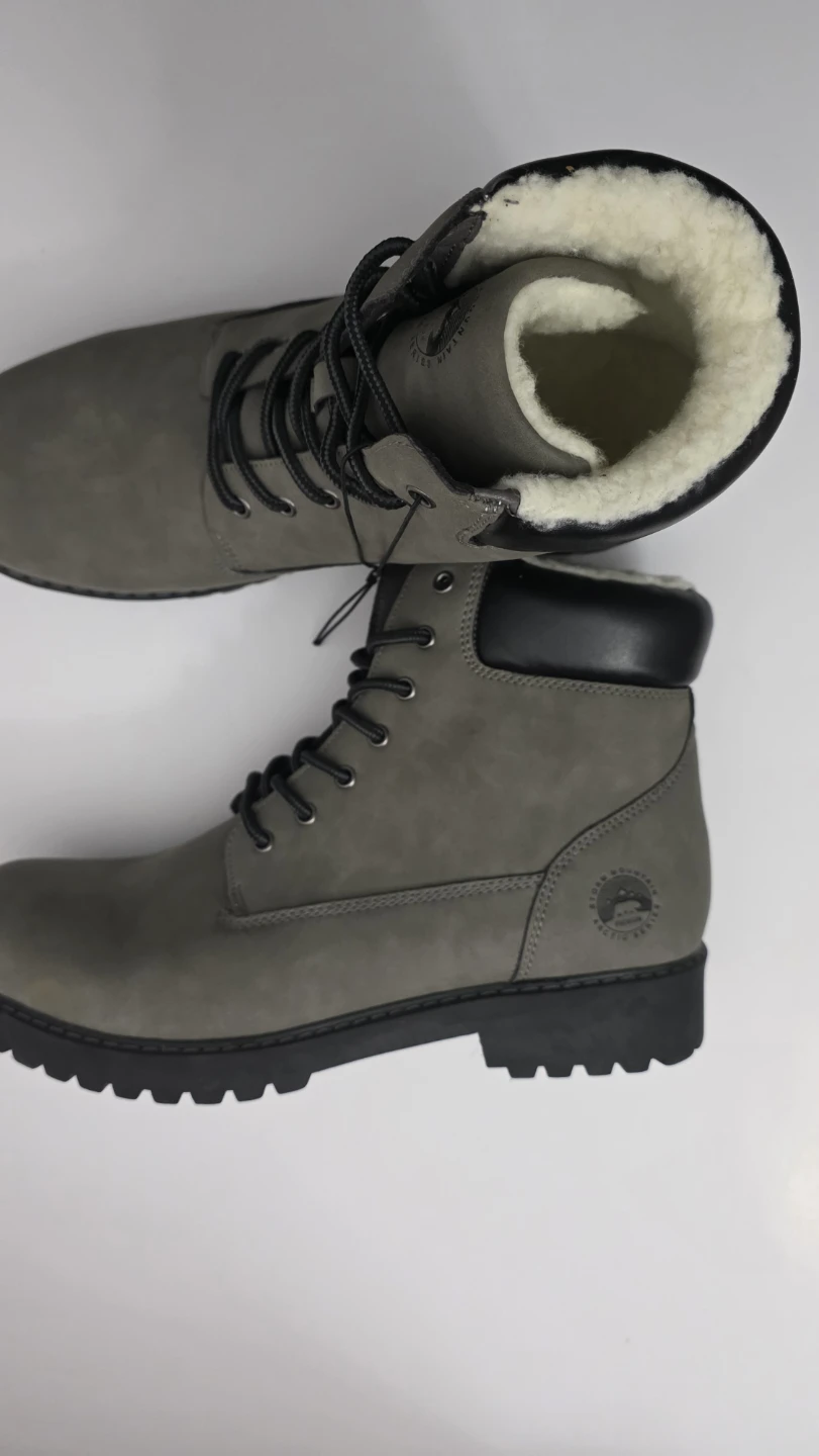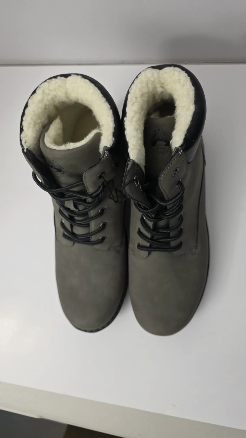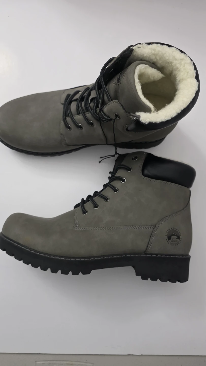 Warm winter boots from Wind River. They're grey with a faux leather exterior and cozy sherpa lining. The lug sole provides good traction.