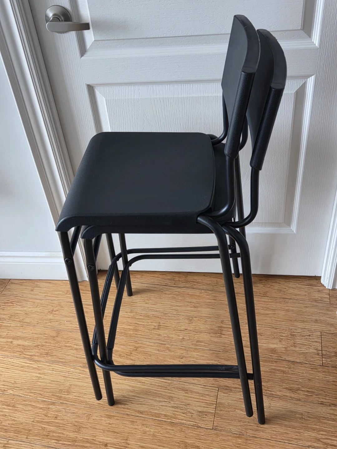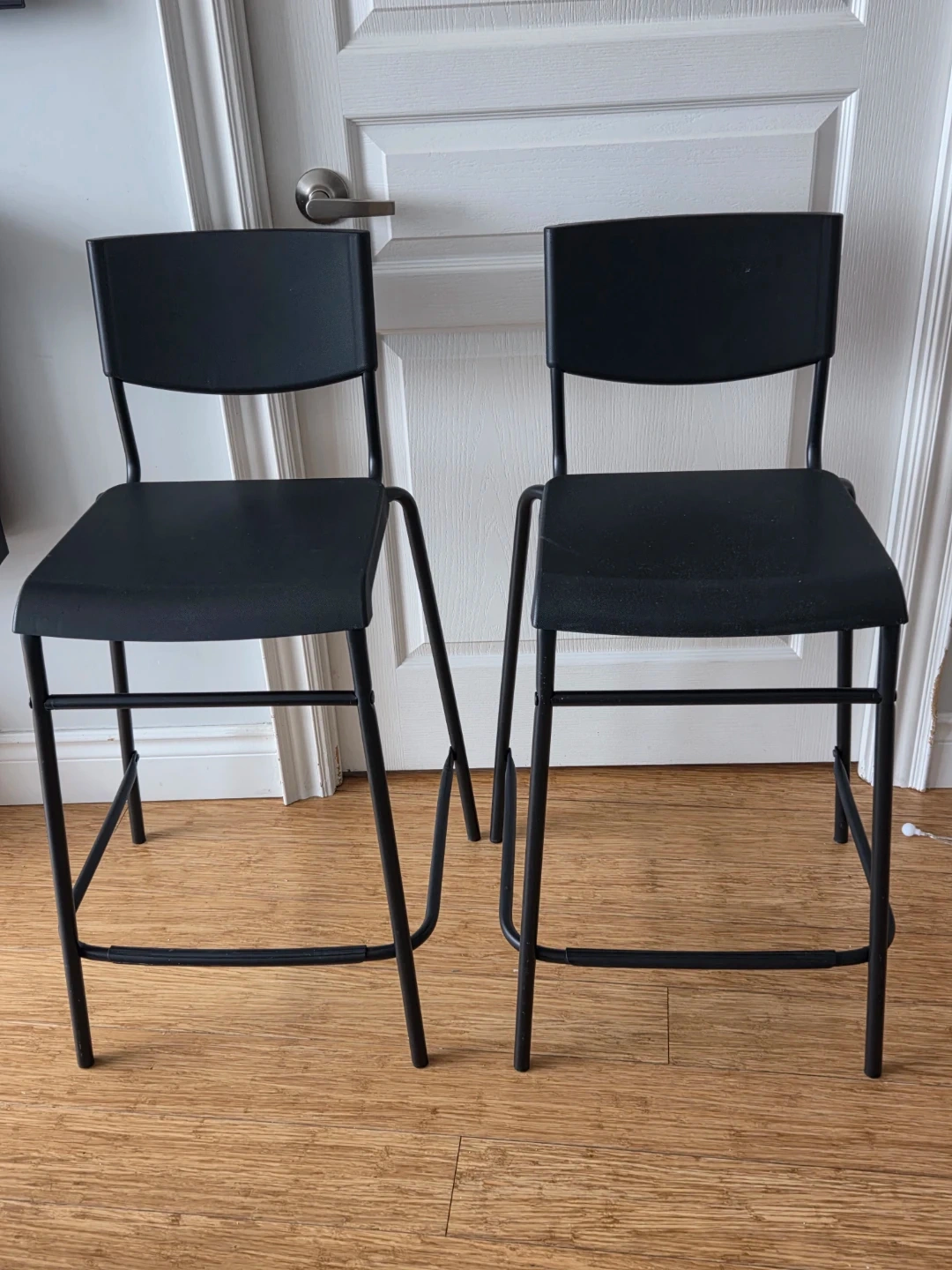 These black bar stools are sturdy and stackable. They have a metal frame and a plastic seat and back. Seat height is 63 cm (24 3/4").