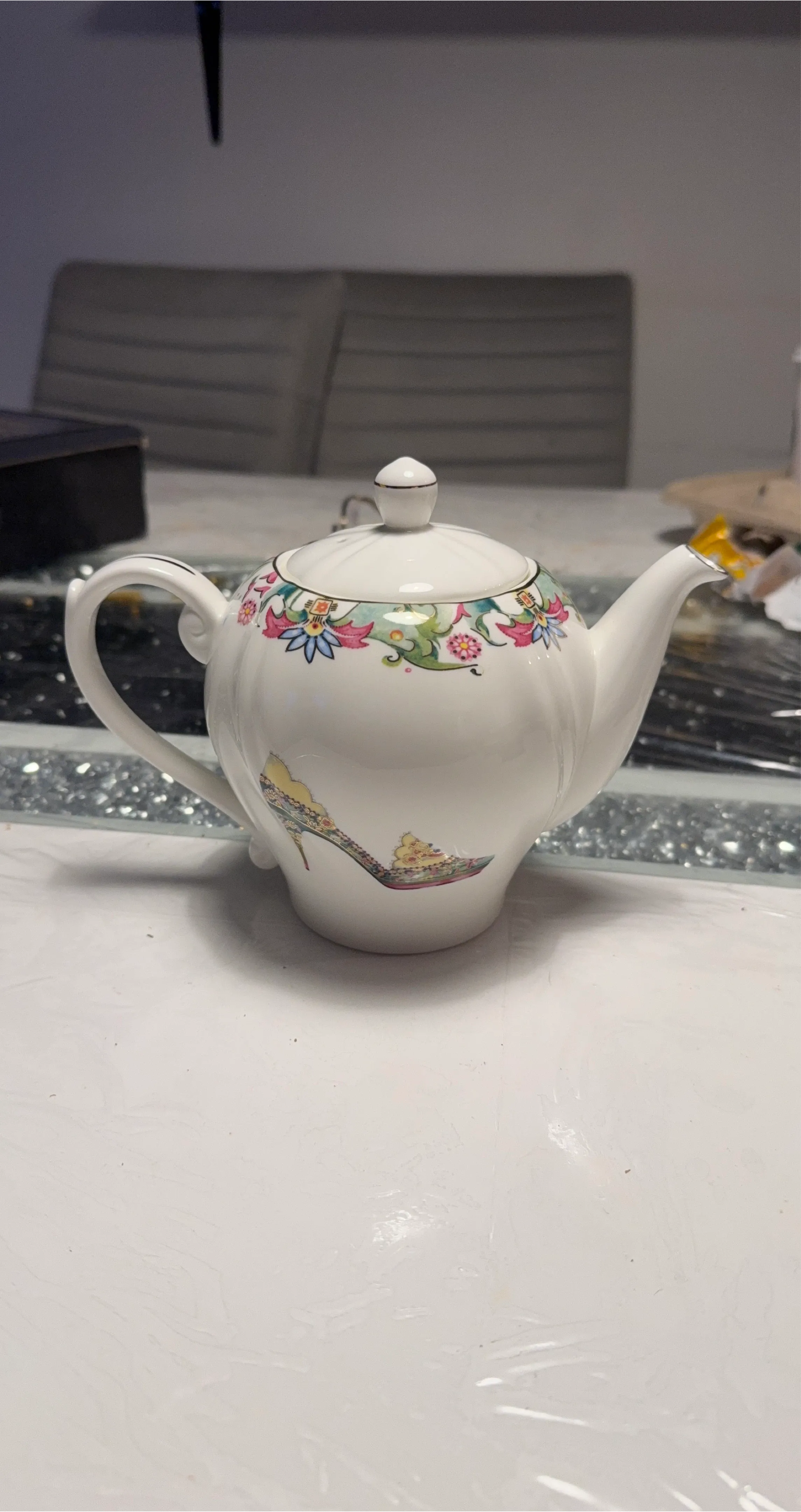 White ceramic teapot adorned with a colourful floral pattern and a decorative high-heeled shoe graphic. It features a classic teapot shape with a spout, handle, and lid. This teapot is made of ceramic. It's great for serving tea at gatherings or for personal use.