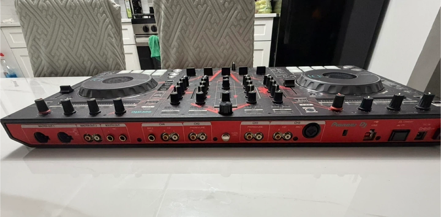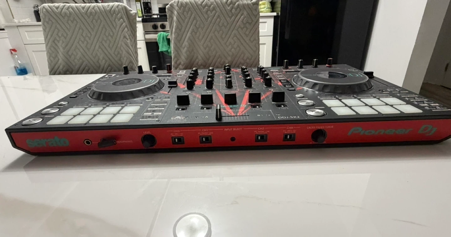 This is a Pioneer DJ DDJ-SX2 controller, used for DJing. It's compatible with Serato software and Virtual DJ .Includes a sturdy case for transport. All buttons, jog wheels, and faders are present and appear functional. With charger cable..