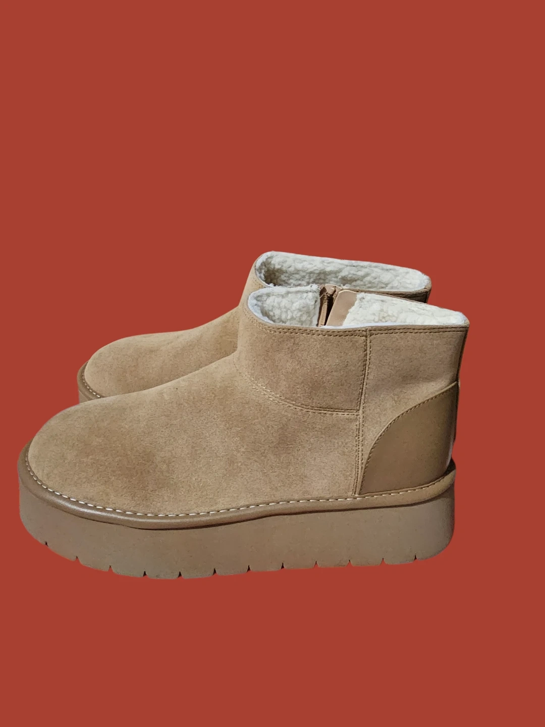 New size 9 Cozy tan suede winter boots with a plush lining and a convenient side zipper. They feature a chunky platform sole for added style and comfort. The material is suede with a faux fur lining.