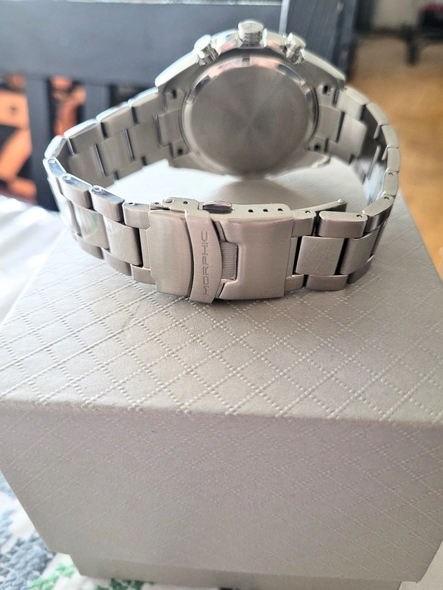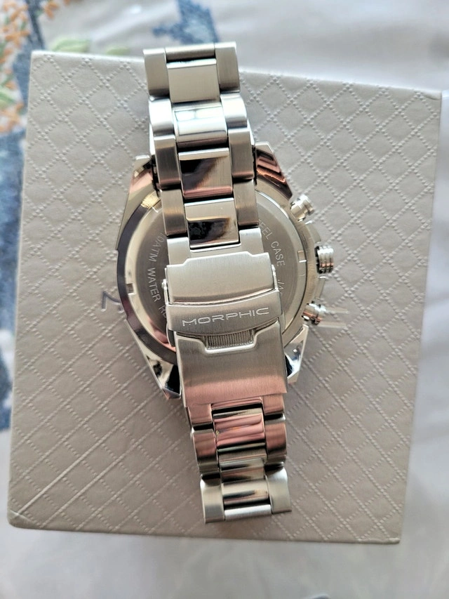 Brand new in the box with authenticity card. Retail value: $800. Model MPH9401, Series M94. Features a 316L surgical-quality stainless steel case and bracelet, Japanese Miyota OS21 quartz movement, full-function chronograph, non-glare scratch-resistant mineral crystal, logo-engraved stainless steel caseback and clasp. Luminous hands and markers, date indicator, 24-hour sub-dial. 47mm case diameter, 10 ATM water resistance. Pick up area: Sheppard & Don Mills. Cash accepted. Cashless payment accepted.