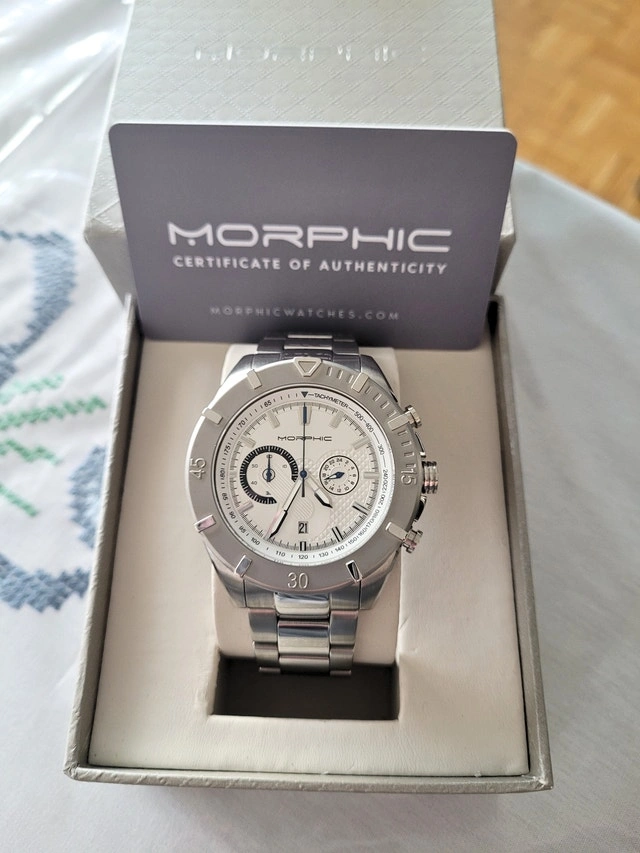 Brand new in the box with authenticity card. Retail value: $800. Model MPH9401, Series M94. Features a 316L surgical-quality stainless steel case and bracelet, Japanese Miyota OS21 quartz movement, full-function chronograph, non-glare scratch-resistant mineral crystal, logo-engraved stainless steel caseback and clasp. Luminous hands and markers, date indicator, 24-hour sub-dial. 47mm case diameter, 10 ATM water resistance. Pick up area: Sheppard & Don Mills. Cash accepted. Cashless payment accepted.