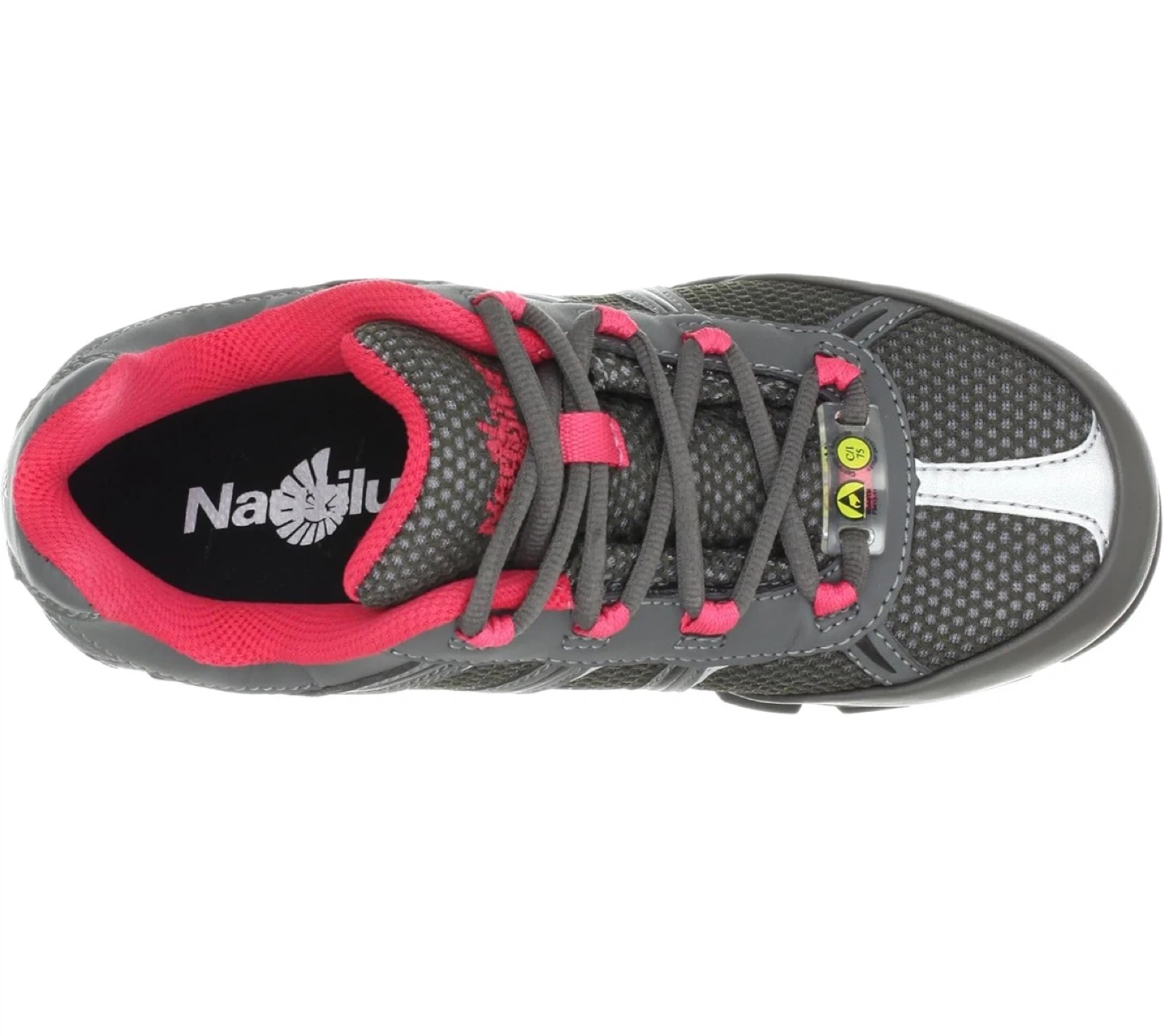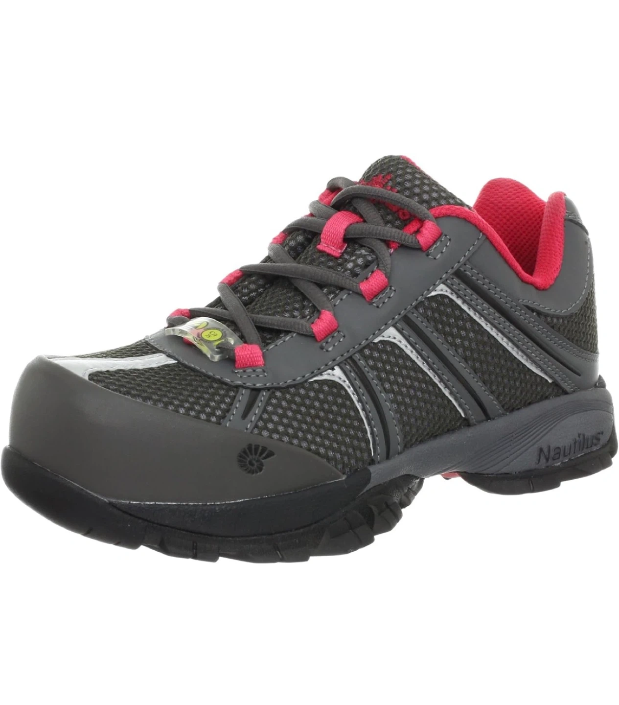 Nautilus women's work shoes in grey with pink accents. These shoes feature a safety toe for protection. They have a breathable mesh upper and a durable rubber outsole.