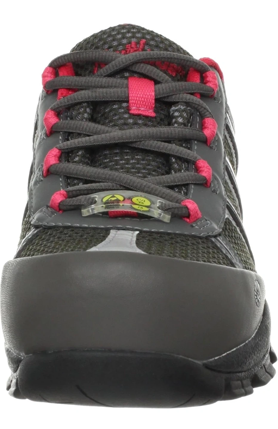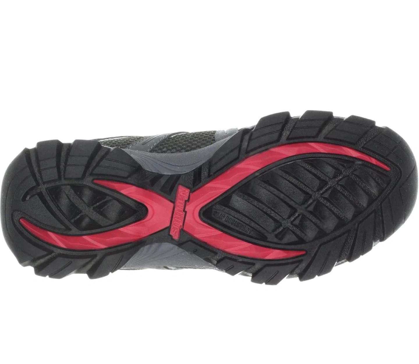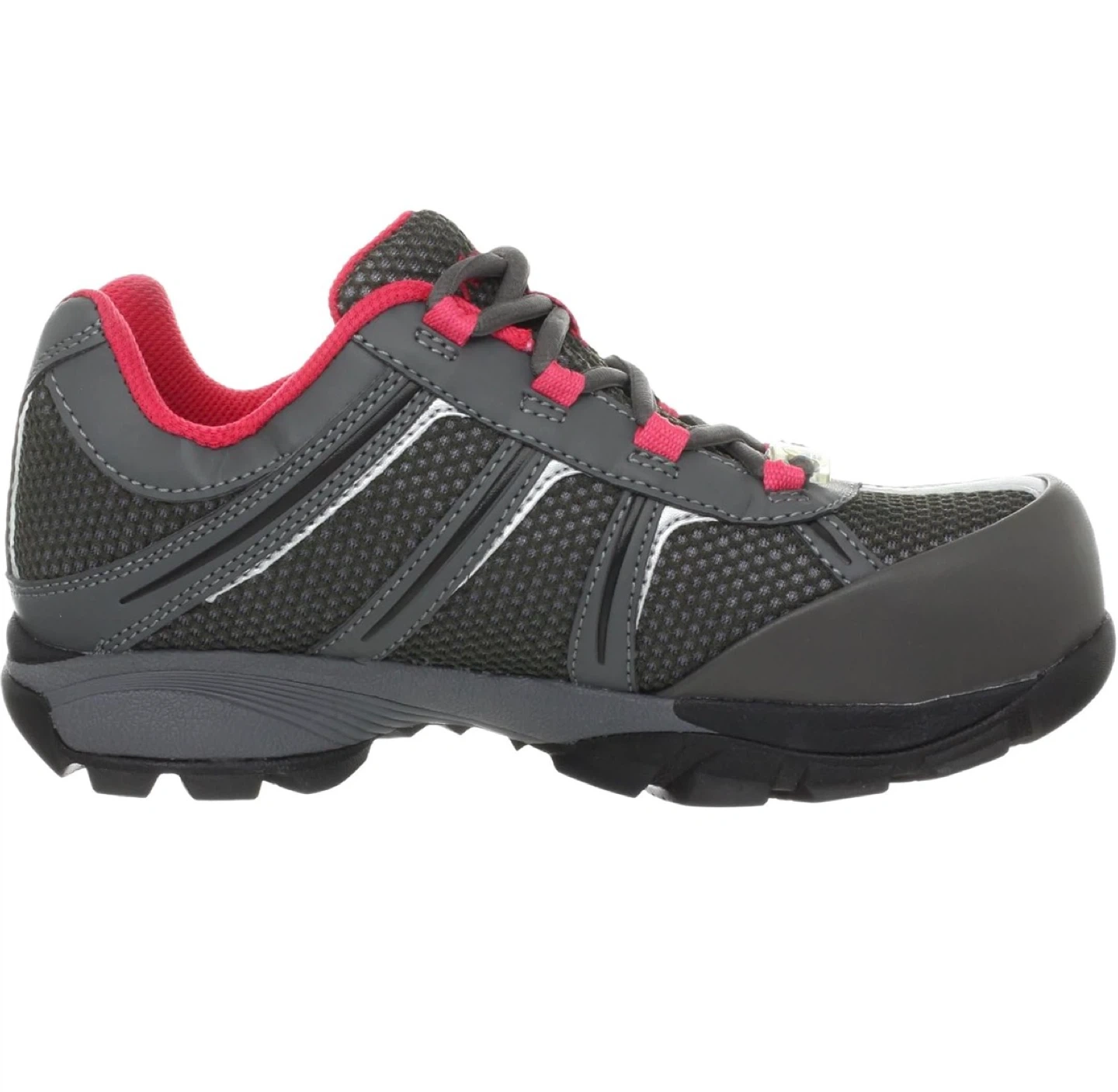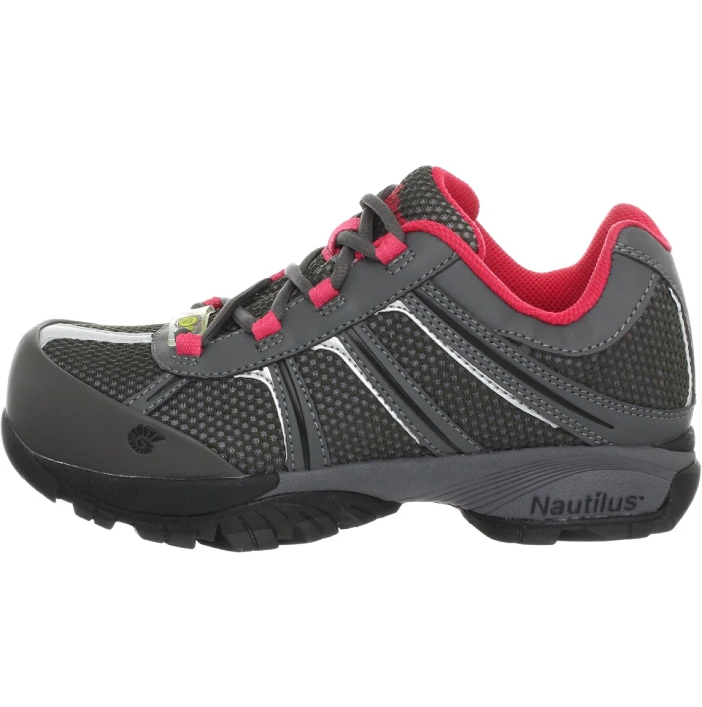 Nautilus women's work shoes in grey with pink accents. These shoes feature a safety toe for protection. They have a breathable mesh upper and a durable rubber outsole.