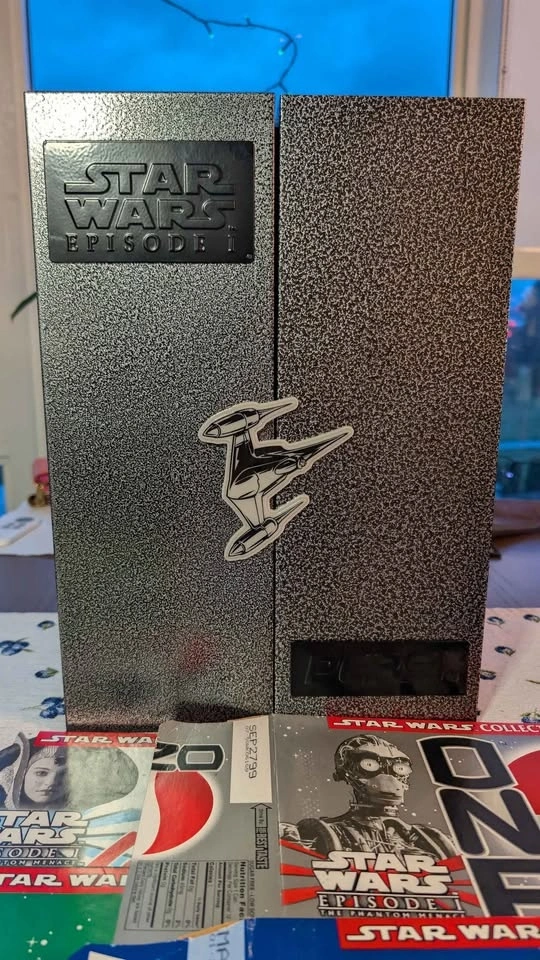 This is a rare and highly sought-after 1999 Star Wars Episode 1 COMPLETE Pepsi 24 Can Set in a collectors display. It includes 24 cans featuring characters like Anakin Skywalker. As a vintage piece from 1999, this item holds sentimental value for fans of science fiction. The brand association with Pepsi adds an extra layer of interest and nostalgia for collectors. The set is in good vintage condition, though 4 cans have minor imperfections.