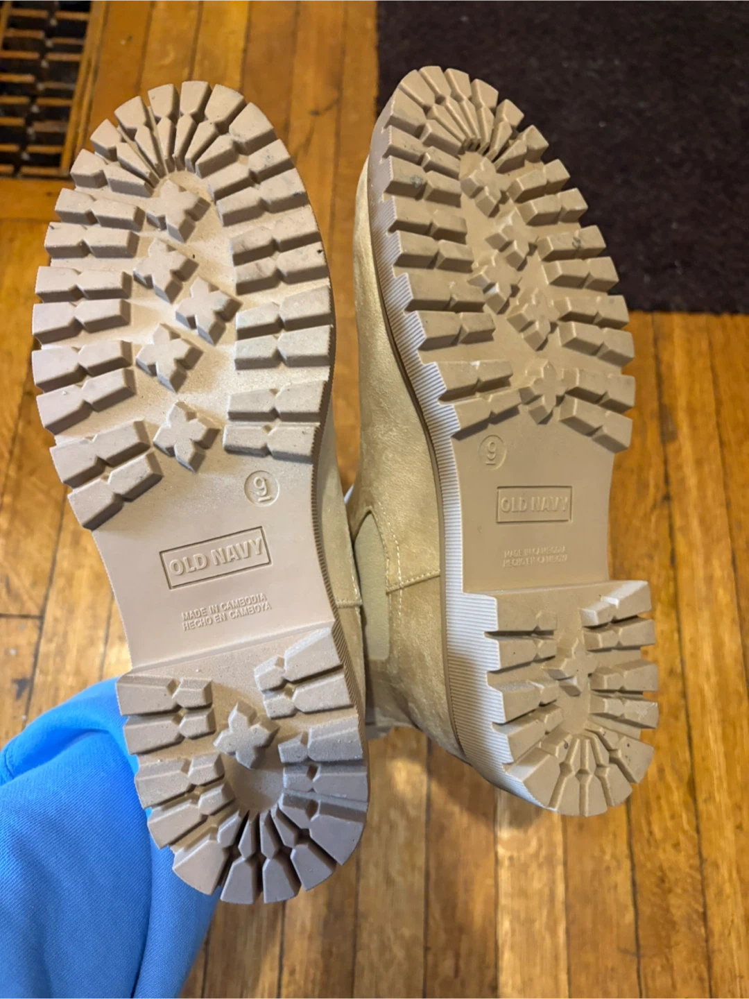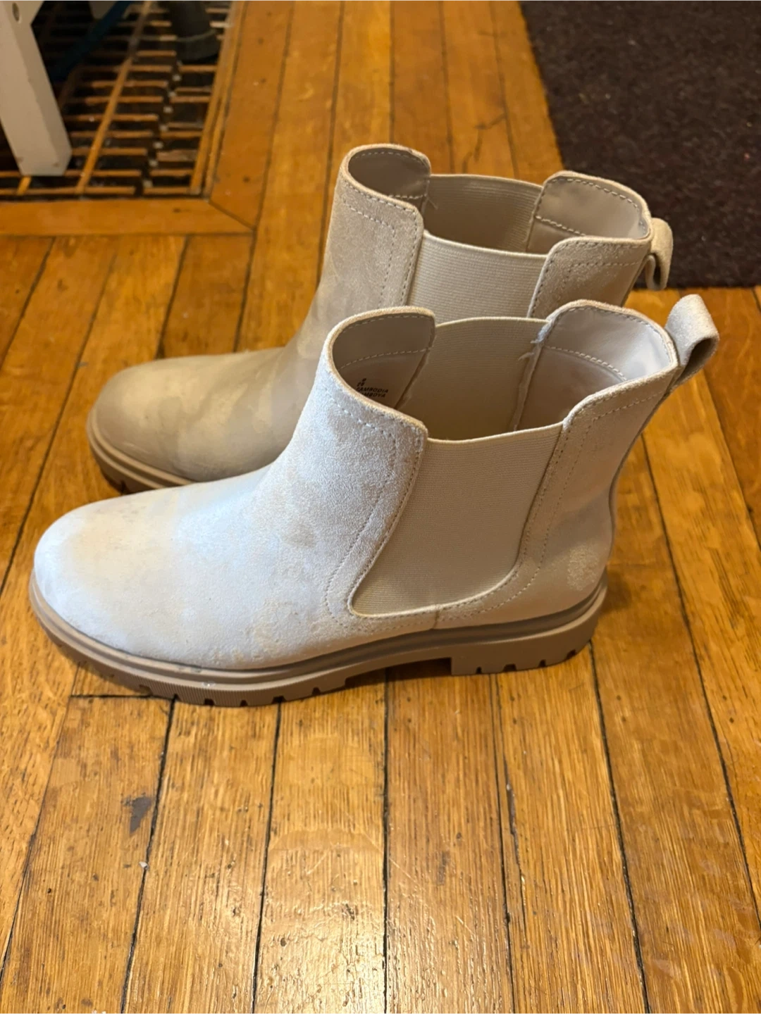Classic Old Navy beige Chelsea boots with a faux suede finish. These slip-on boots feature elastic side panels and a pull tab at the back for easy wear. The lug sole provides good traction. Size is 9. In good used condition.