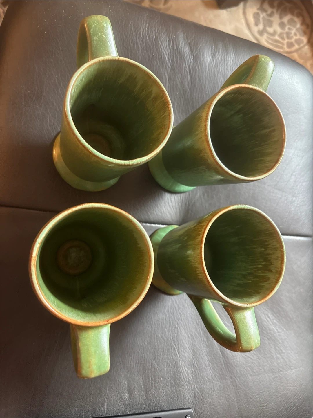 π₯ These four green ceramic mugs feature classic handles and a sturdy base. They appear to be made of stoneware, offering a rustic charm. They're perfect for enjoying your morning coffee or tea!