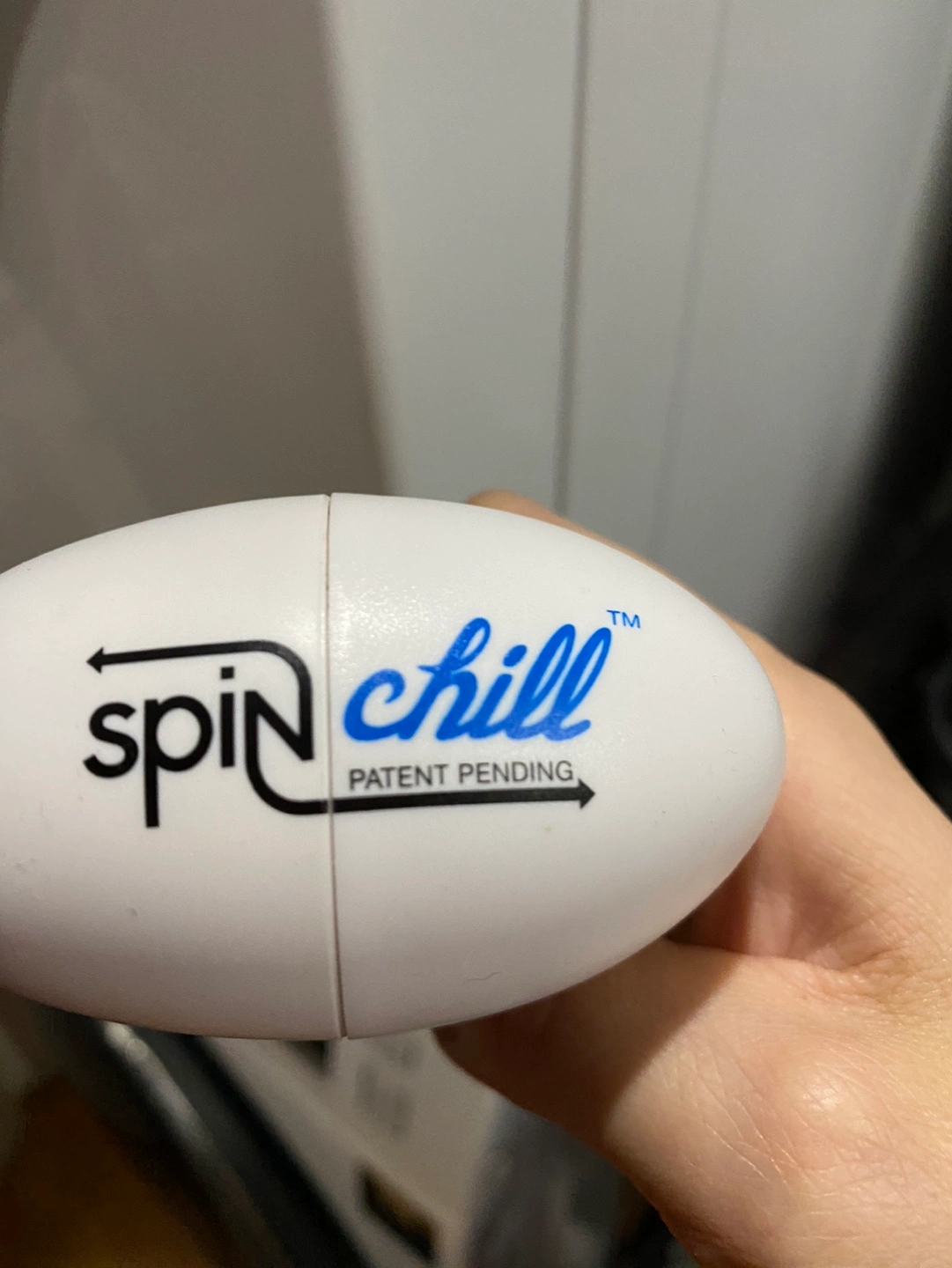 New SpinChill personal cooling device. White and blue plastic. Patent pending. Portable and easy to use beverage cans. Can make beverages cold in 1 minute.