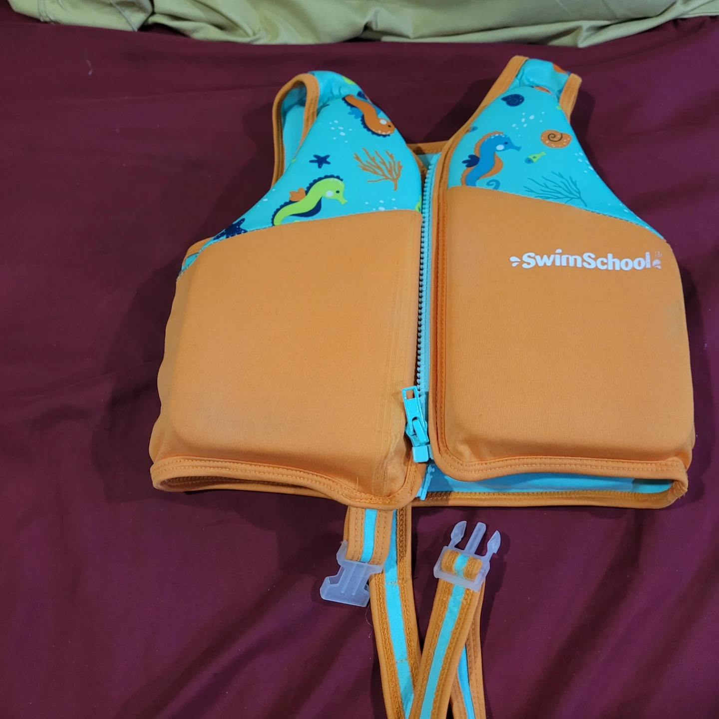 This SwimSchool learn-to-swim vest is designed for children aged 2-4 years, with a maximum weight of 33 lbs. It's made from 100% polyester and features a bright orange and teal design with sea creature graphics. The vest zips up the front and has adjustable straps for a secure fit. It's important that adult supervision is always present when children are using this device.
