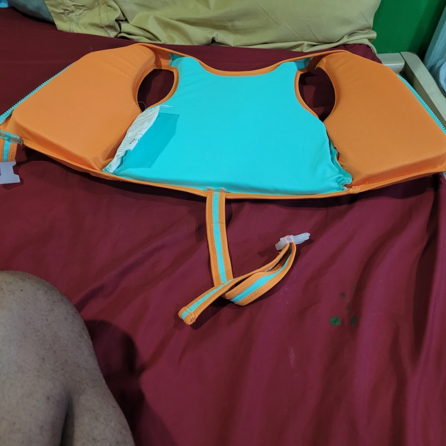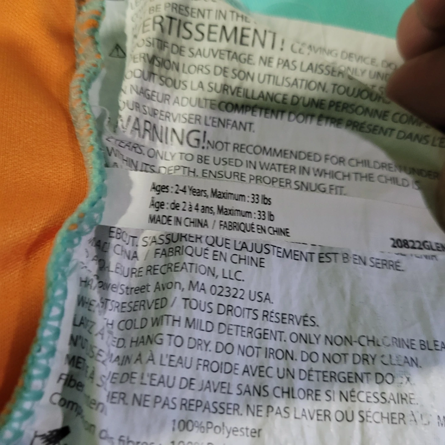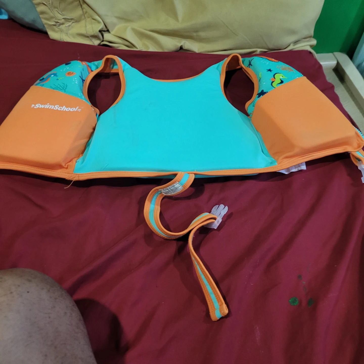 This SwimSchool learn-to-swim vest is designed for children aged 2-4 years, with a maximum weight of 33 lbs. It's made from 100% polyester and features a bright orange and teal design with sea creature graphics. The vest zips up the front and has adjustable straps for a secure fit. It's important that adult supervision is always present when children are using this device.