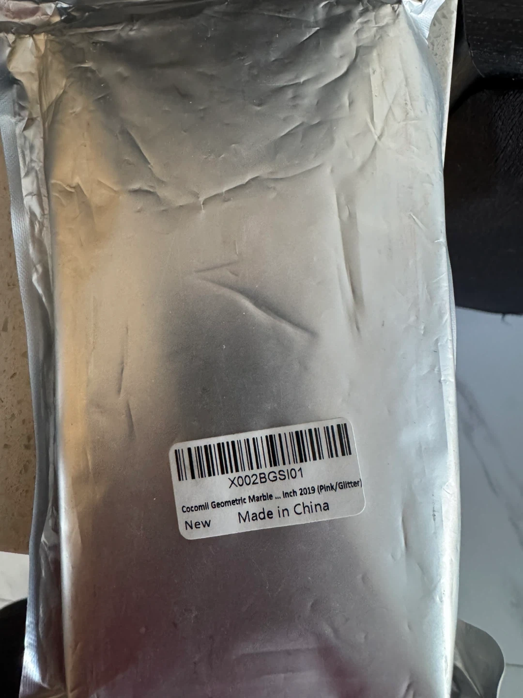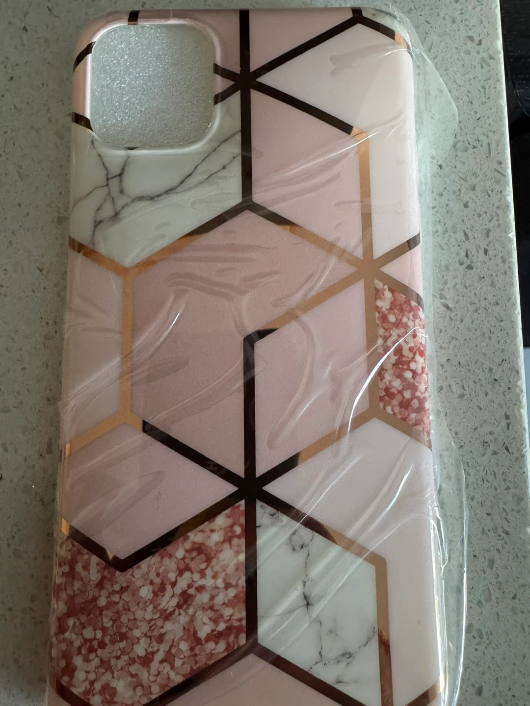 This Cocomii phone case features a geometric marble design with pink and glitter accents. It's designed for a slim, sleek fit. Protects your phone with style!