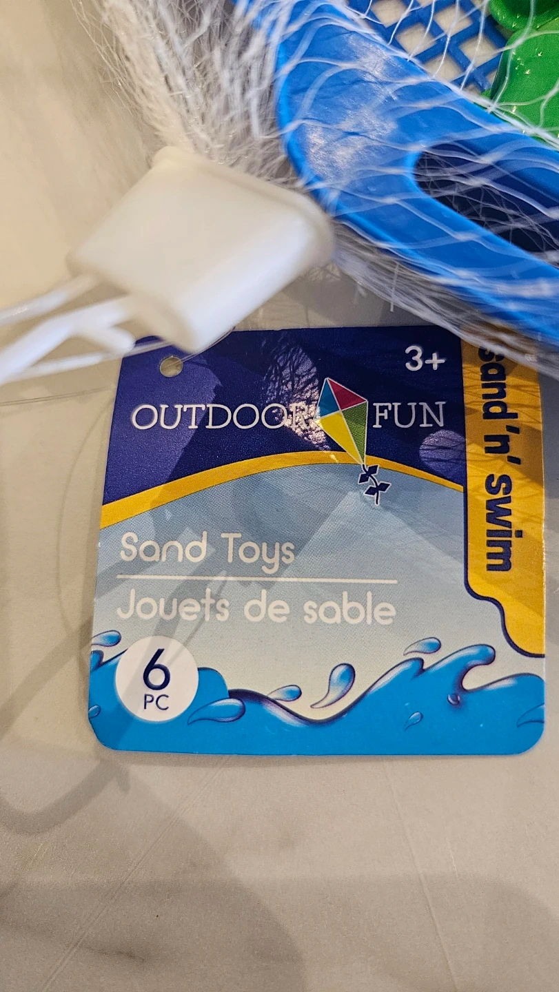 This is a 6-piece set of sand toys perfect for outdoor fun. Includes a blue bucket with a sieve, a yellow shovel, a pink spade, and other colourful sand moulds. Recommended for ages 3 and up.