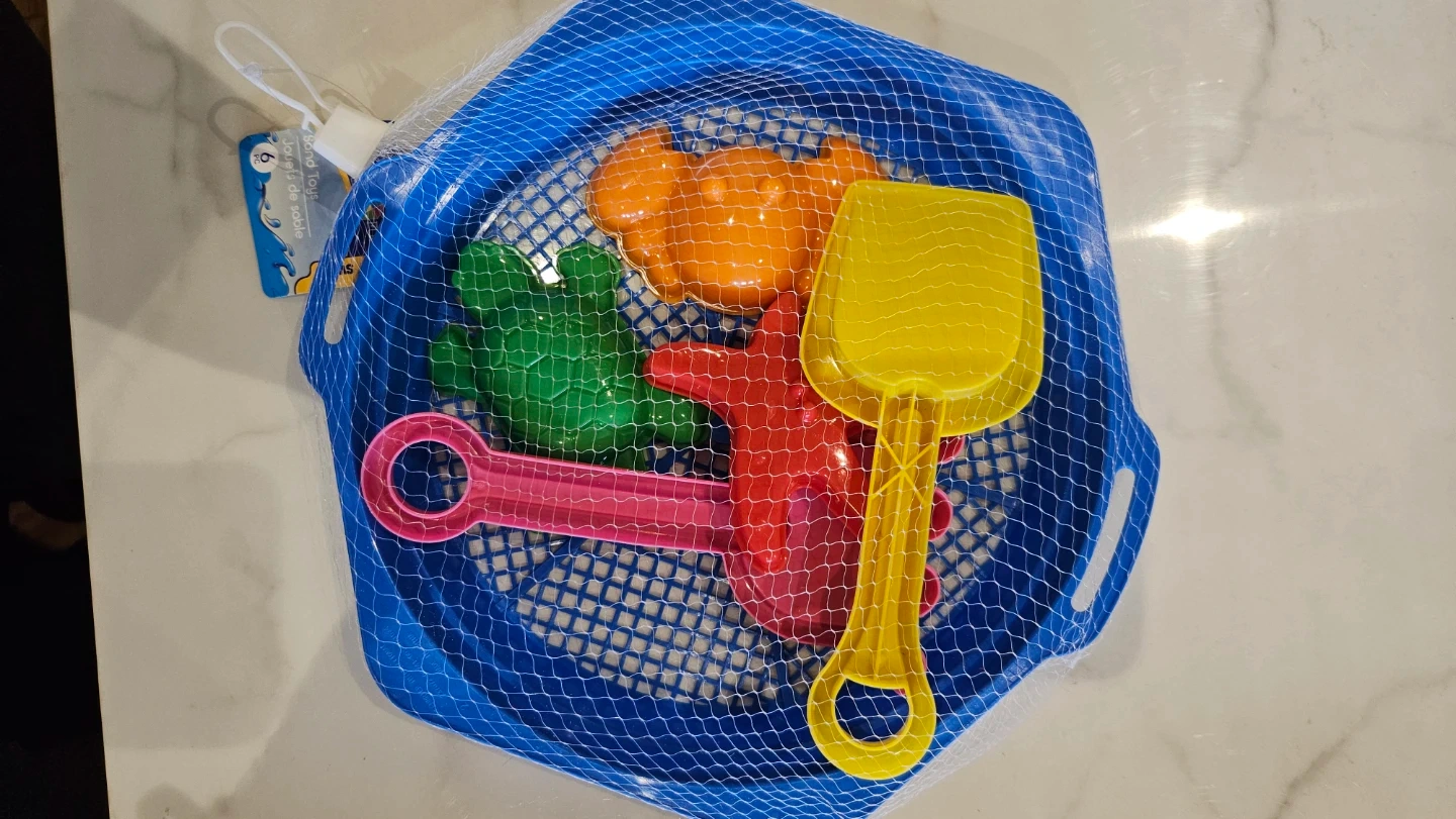 This is a 6-piece set of sand toys perfect for outdoor fun. Includes a blue bucket with a sieve, a yellow shovel, a pink spade, and other colourful sand moulds. Recommended for ages 3 and up.