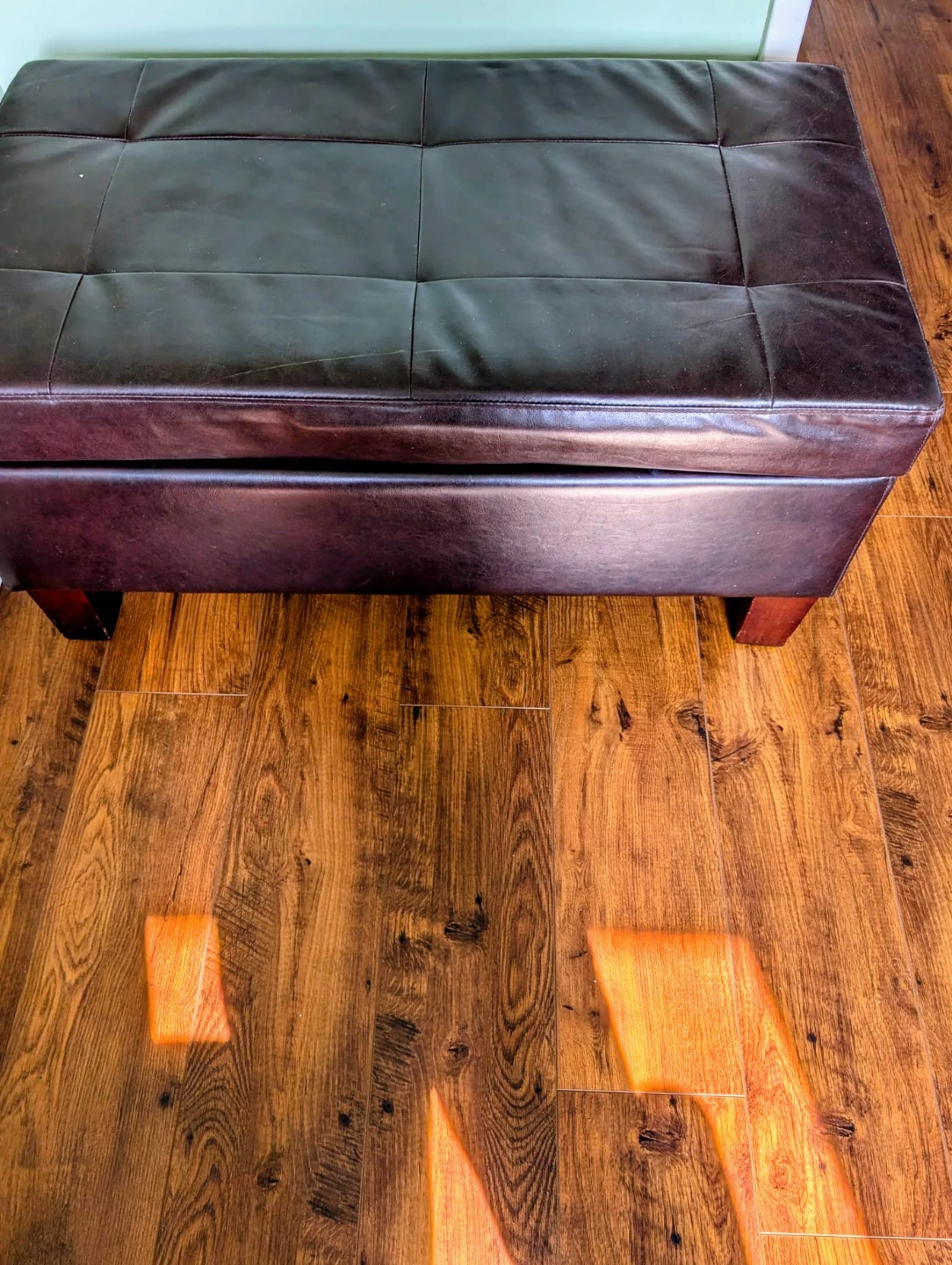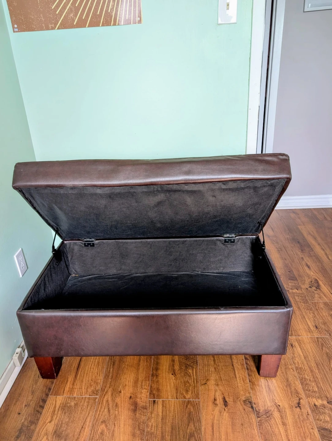 It's upholstered in faux leather with a hinged lid for access to storage inside.