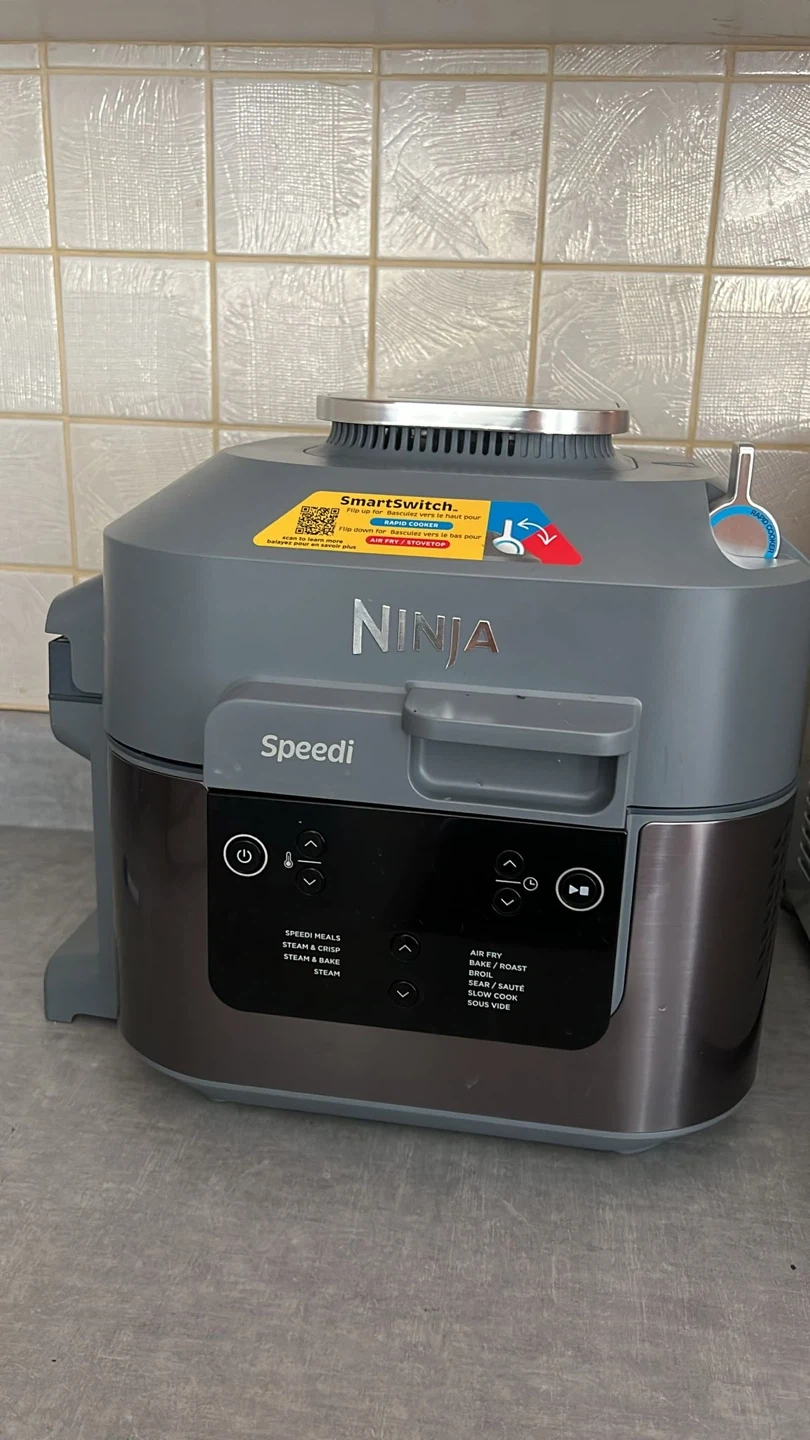 Ninja Speedi rapid cooker. It has multiple cooking functions including steam, steam & crisp, steam & bake, air fry, bake, roast, broil, sear, slow cook, and sous vide. This appliance offers a versatile way to cook meals quickly.