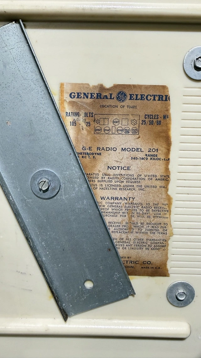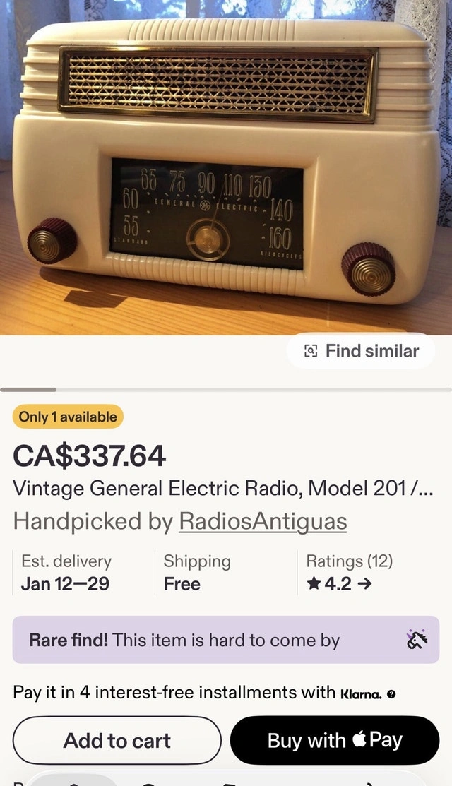 1948 General Electric radio model 201. AM reception, 6 tubes. The casing is in excellent condition, with no cracks or chips, and has a nice shine. Excellent glass sphere cover, original knobs, original power cord. Perfect working condition. Last picture is one on Etsy currently selling for over $300
