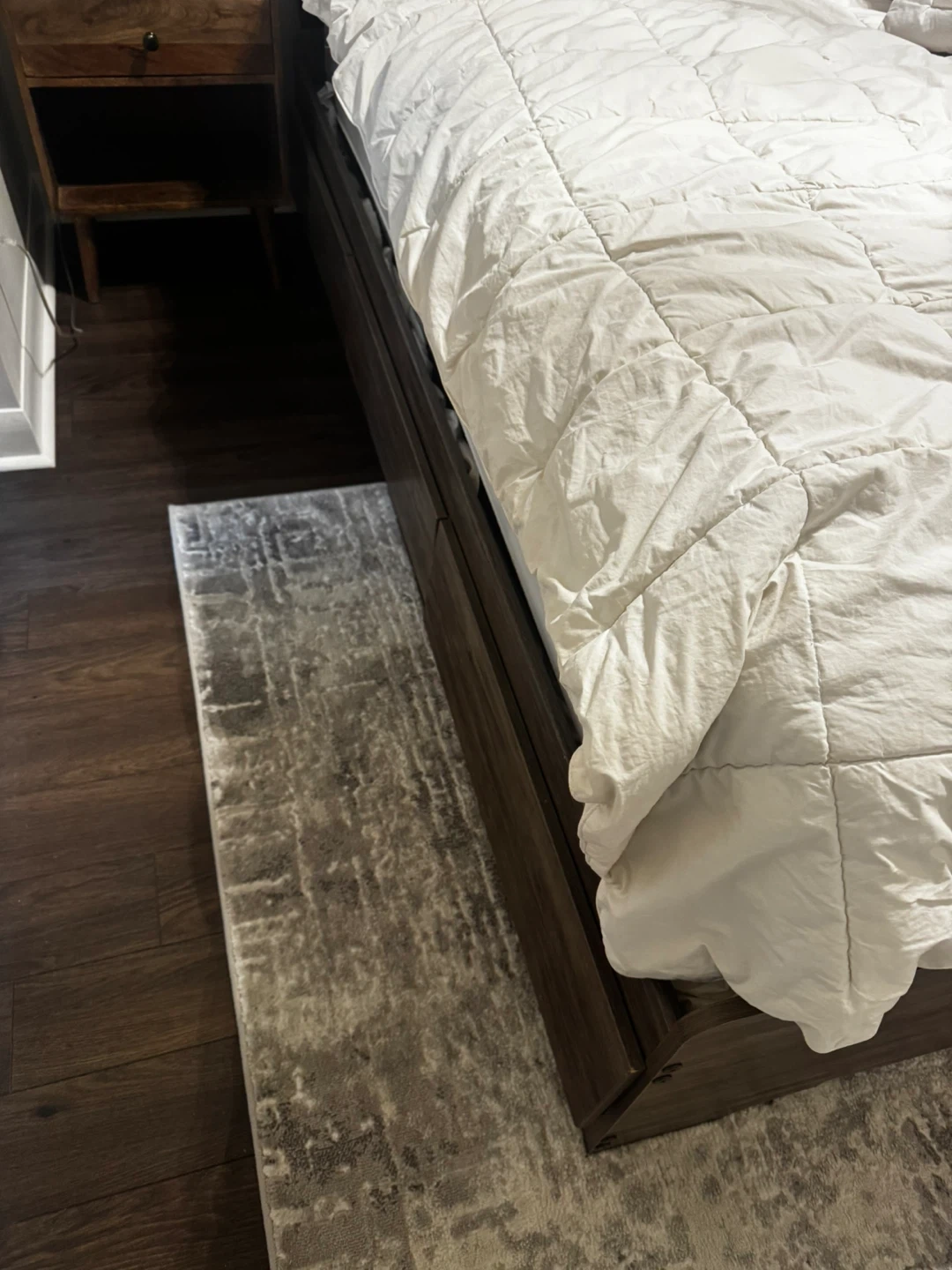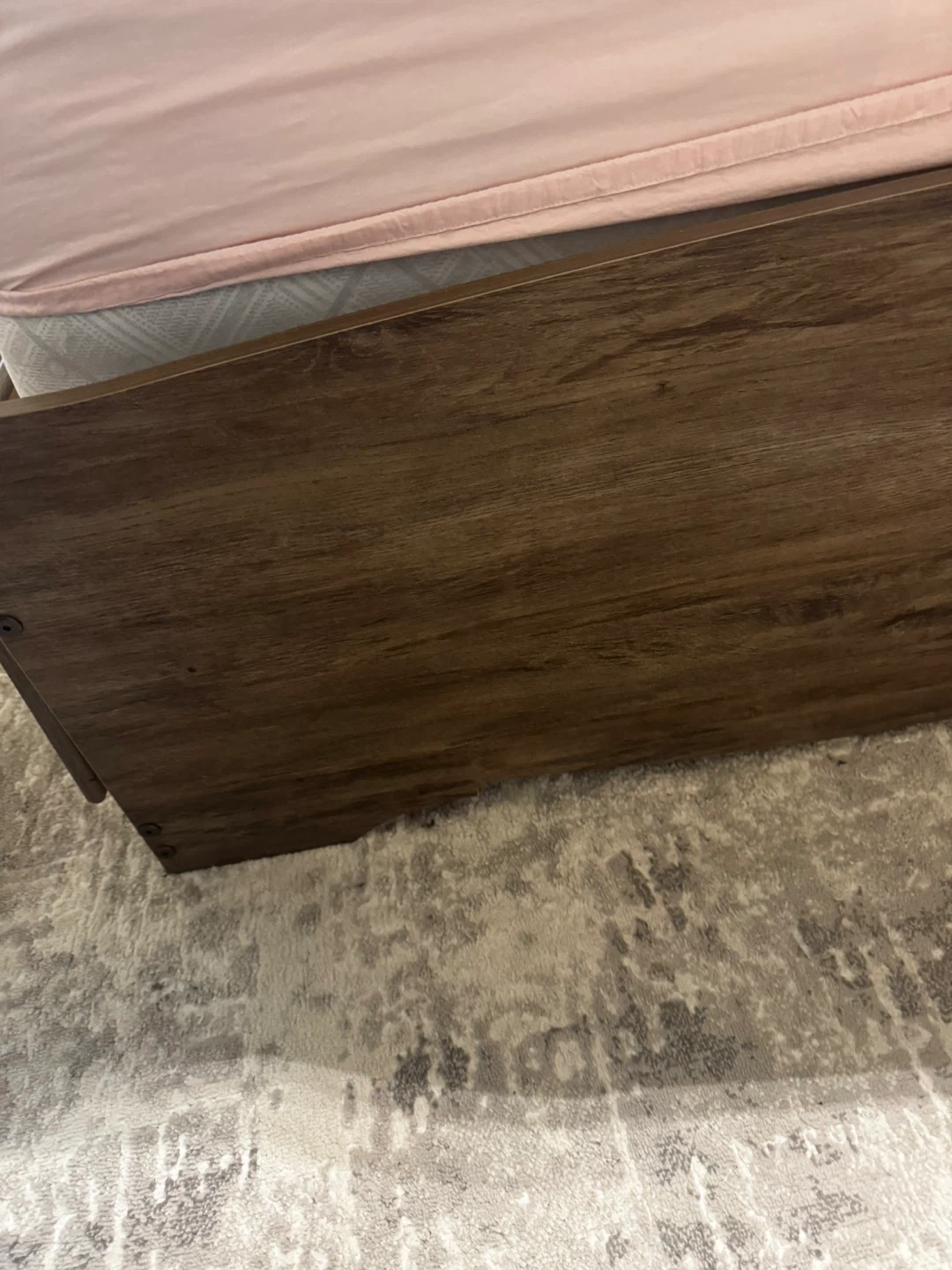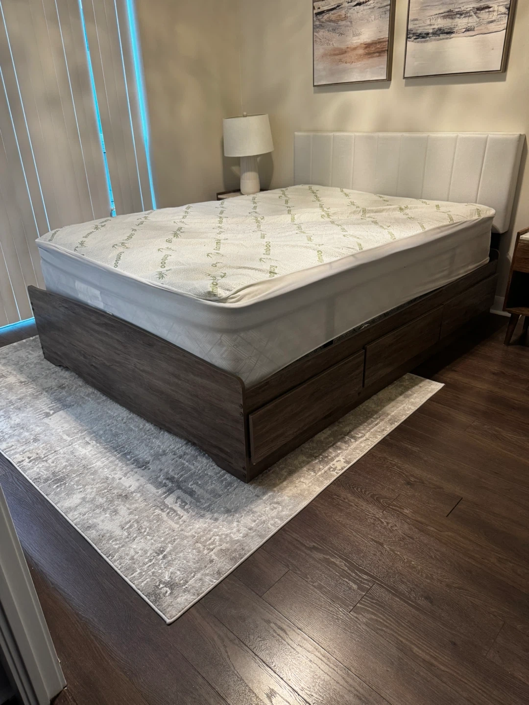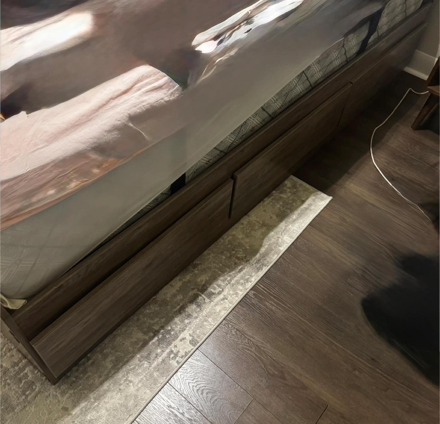 This bed frame is queen size and in EUC. It features 6 built-in storage drawers. It's a sturdy and practical addition to any bedroom.