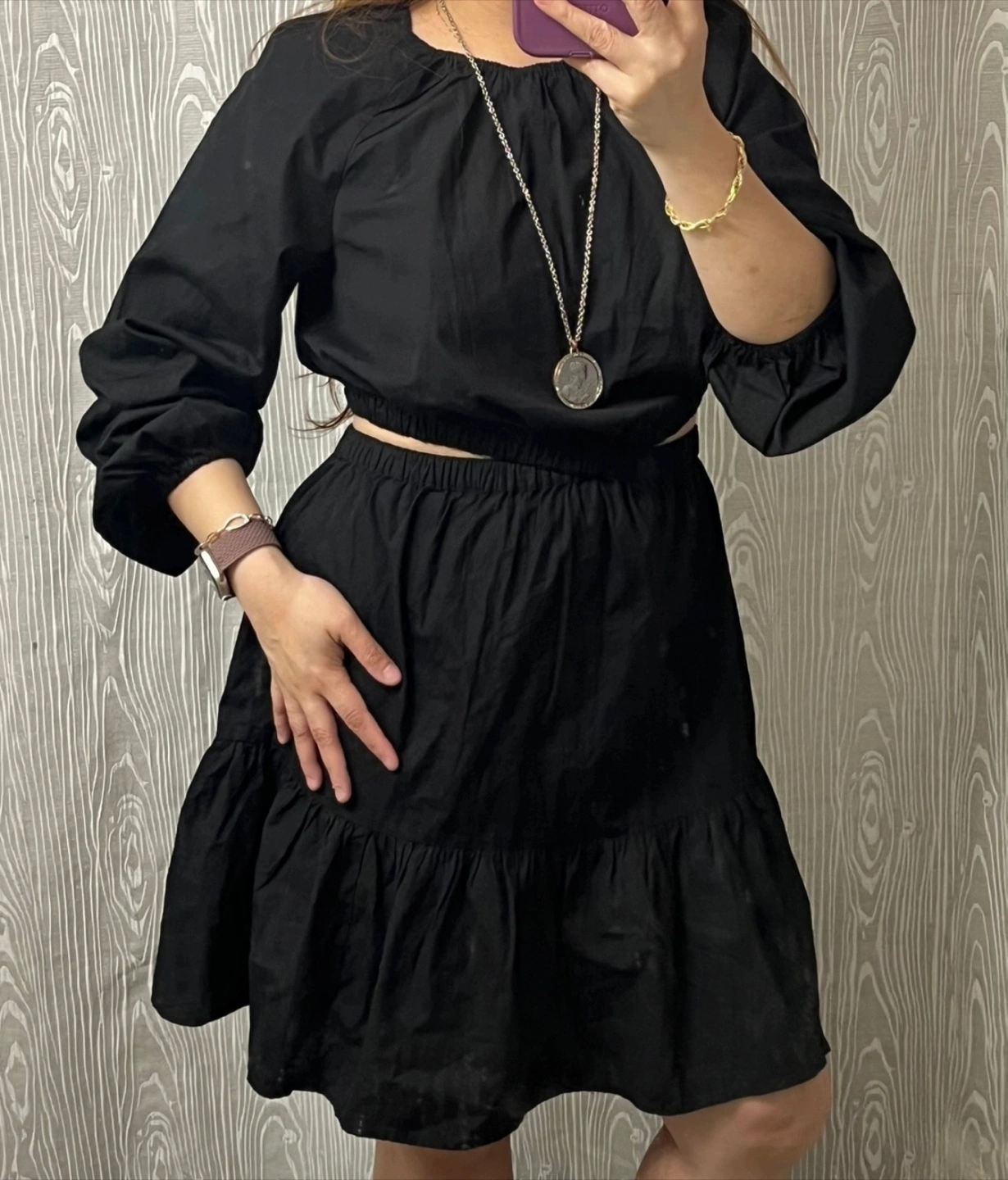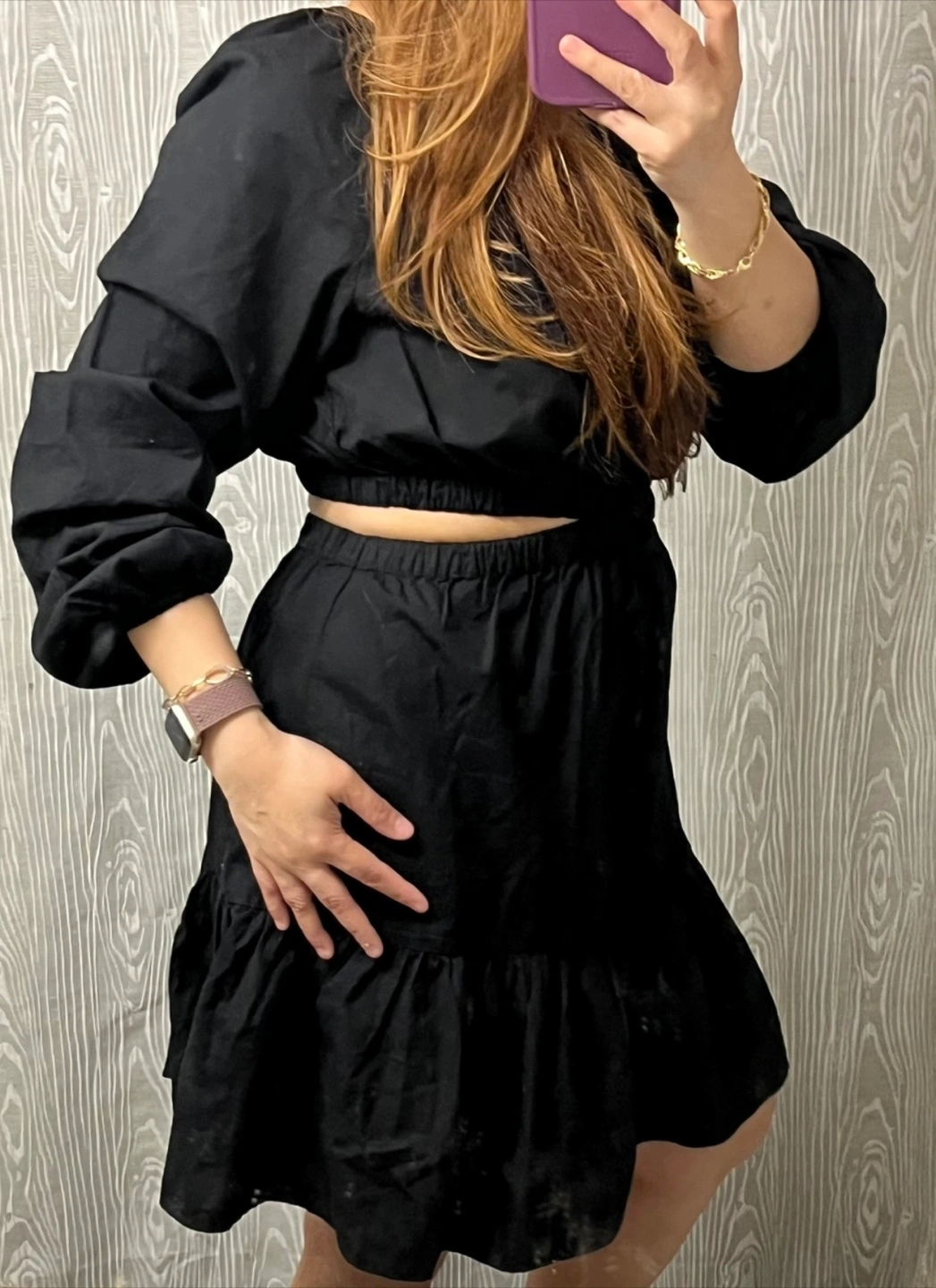 Selling a cute black dress.The top is a cropped style with long sleeves, and the skirt has a ruffled hem. Perfect for a night out or day out dress.