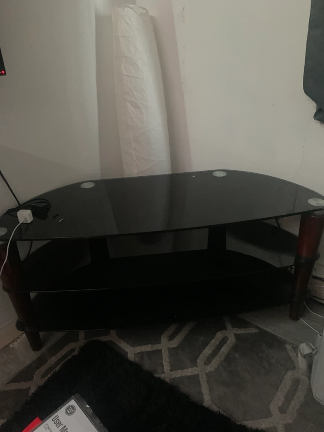 This is a sleek, curved black glass TV stand with three tiers. It has a modern design with wooden accents on the legs. It's spacious enough for your media devices and gaming consoles. Perfect for organizing your entertainment setup!