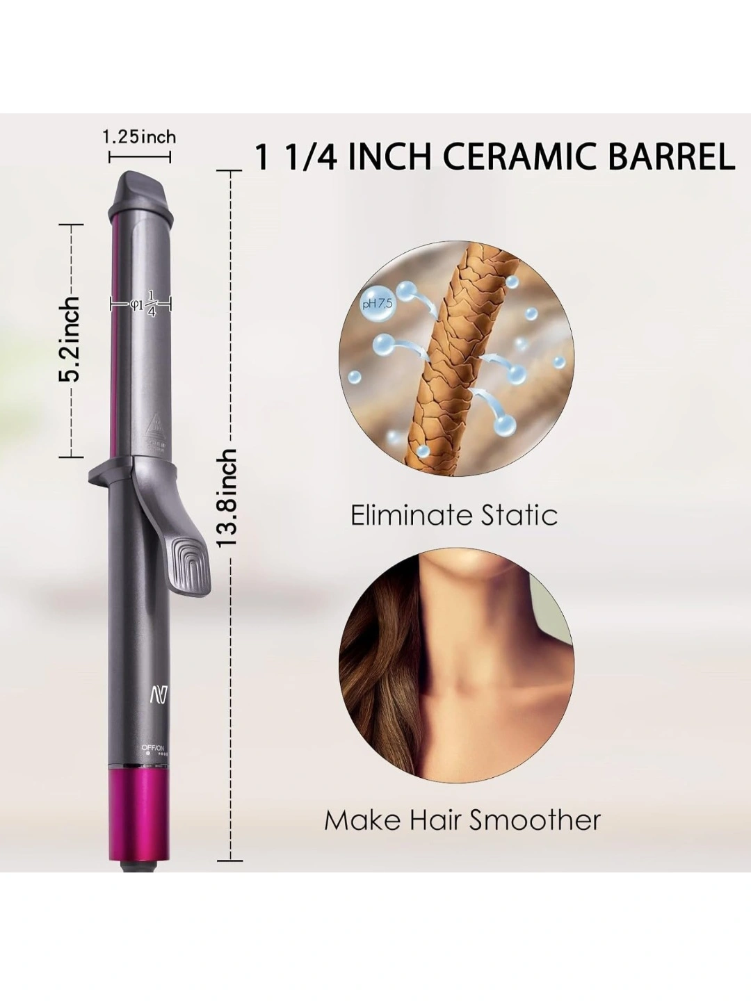 【Tourmaline Ceramic Coating & Negative Ion Technology】Tourmaline ceramic coated barrel makes the 1.25 inch hair curling iron more evenly heated. The negative ion technology can release millions of negative ions when the curling iron is working, eliminate static electricity and increase hair moisture. Thus reduce the damage to hair and create a soft hair style.