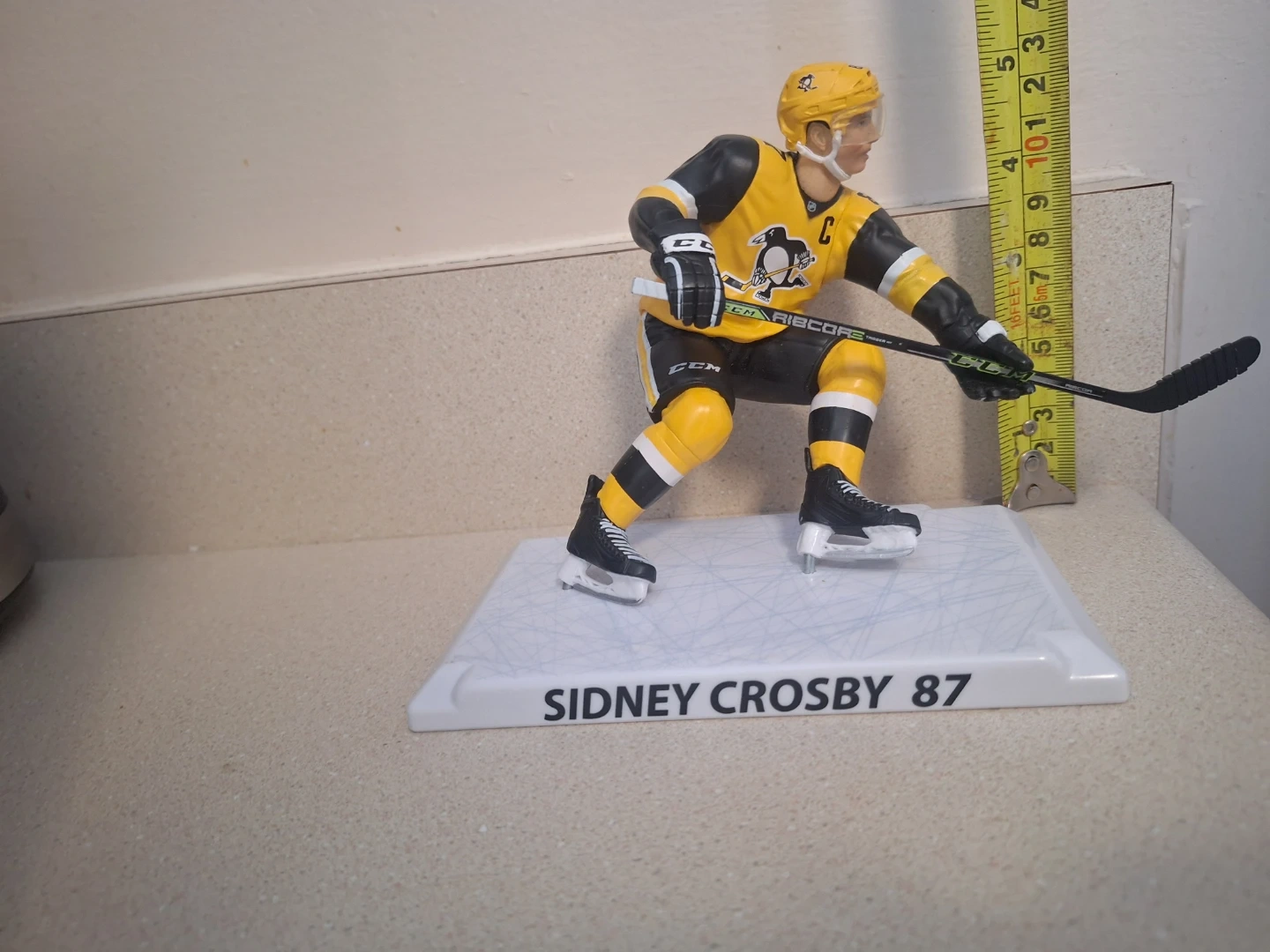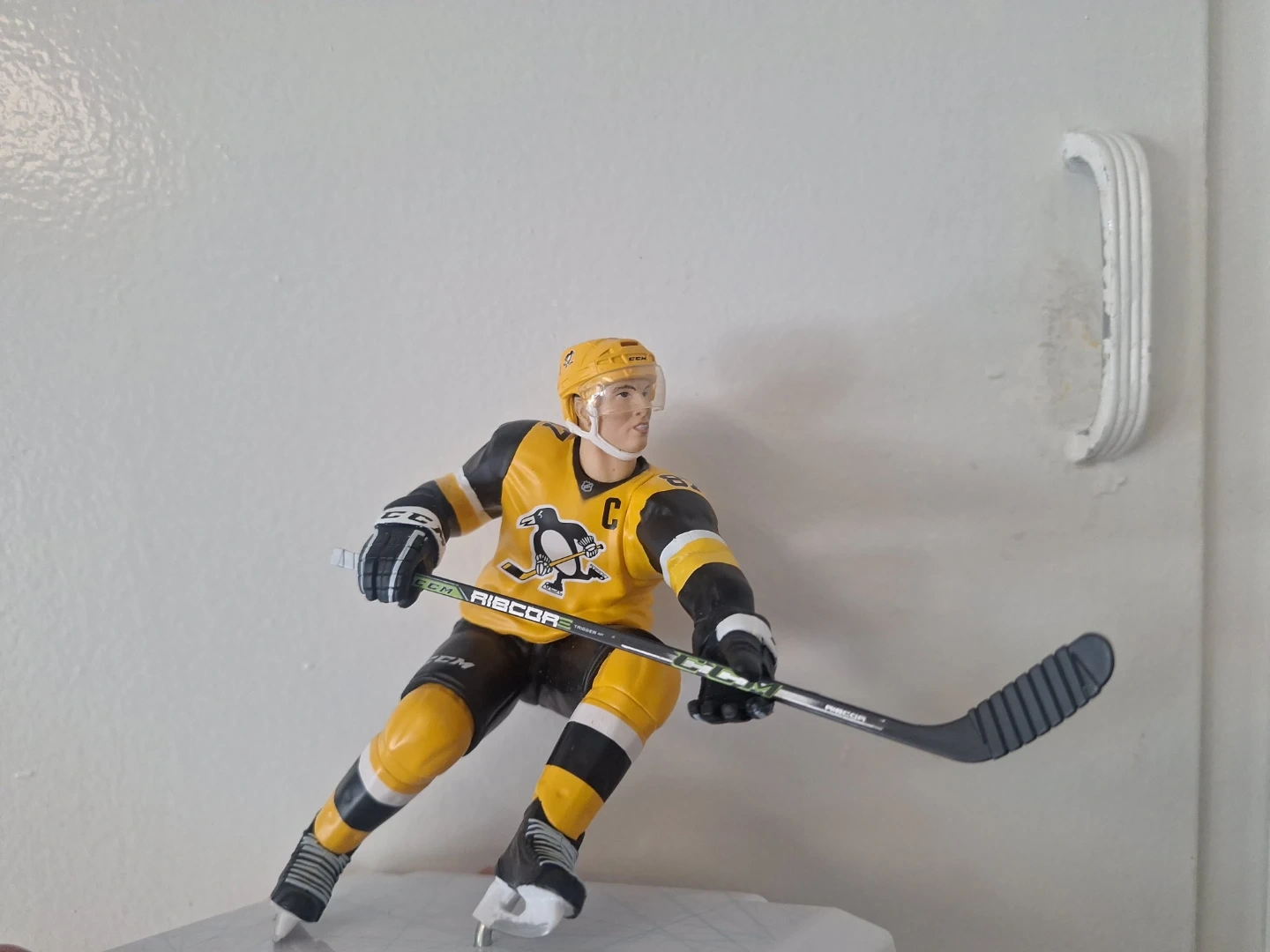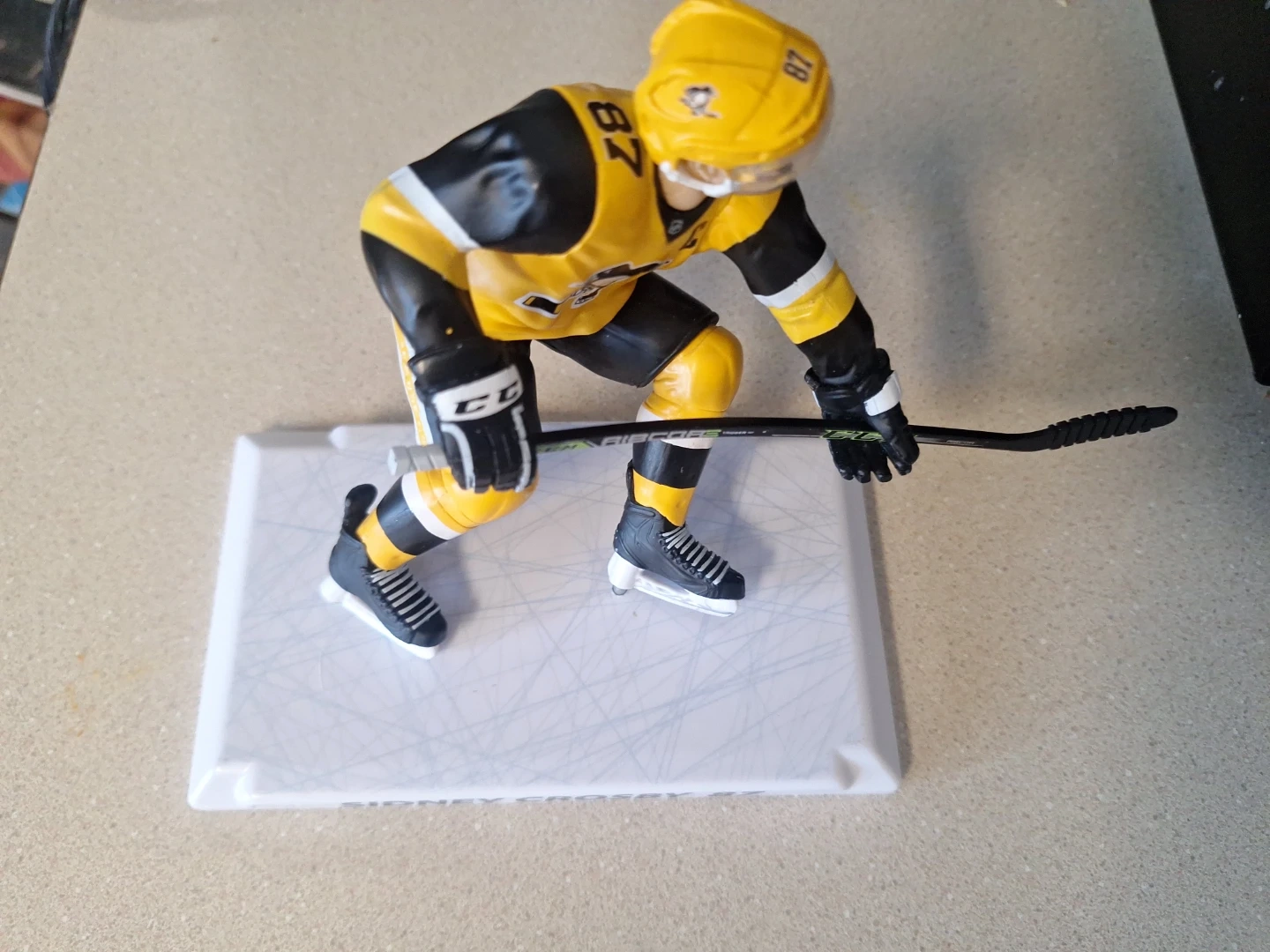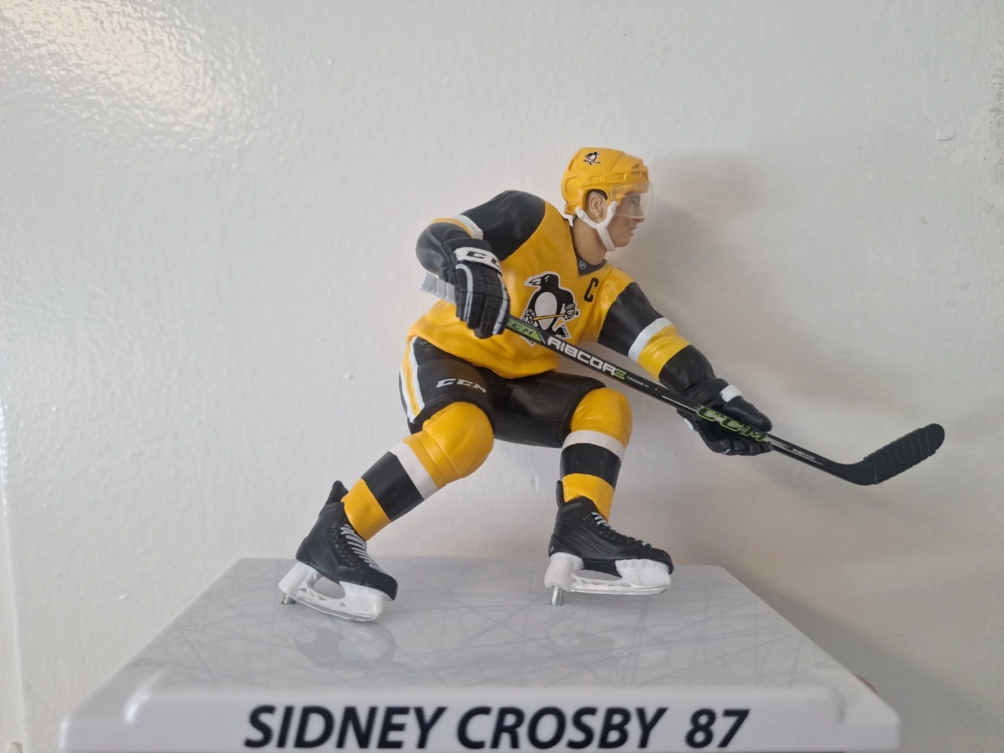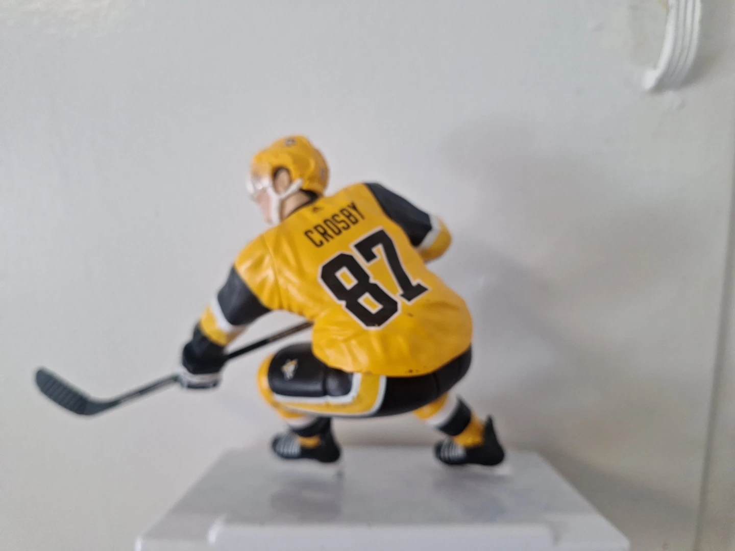 This is a Sidney Crosby hockey figure. It features him in a Pittsburgh Penguins uniform. The figure is mounted on a display base that says "SIDNEY CROSBY 87".
