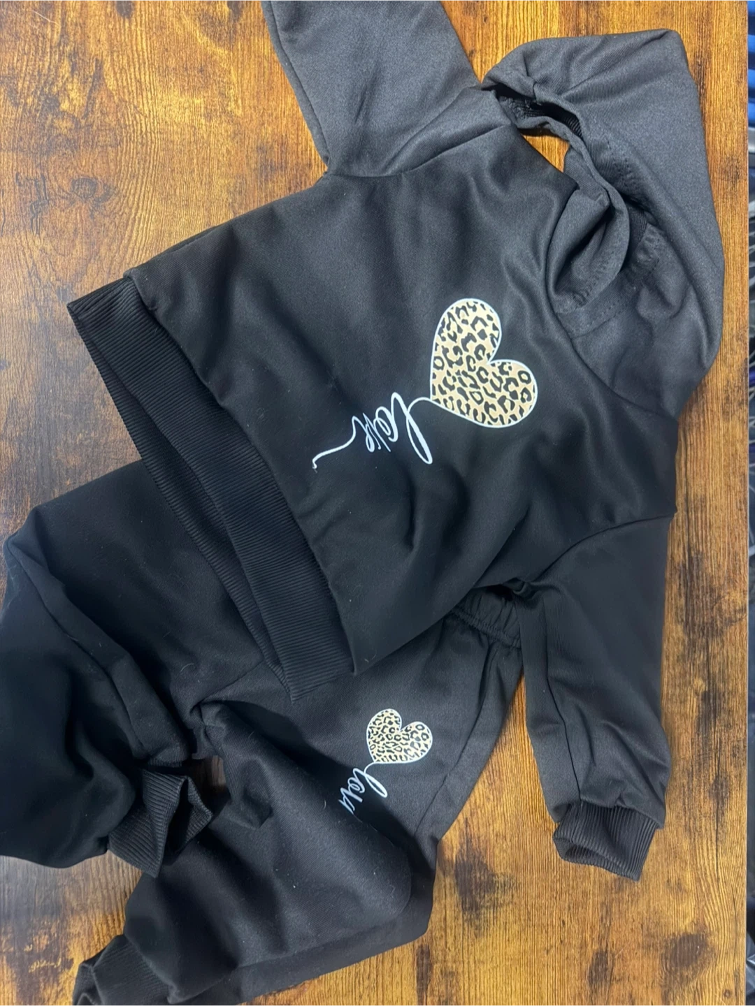 This two-piece set includes a black hoodie and matching pants. Both pieces feature a leopard print heart with the word 'love' on them. The hoodie has a hood and ribbed cuffs. Pants have an elastic waistband and ribbed cuffs.