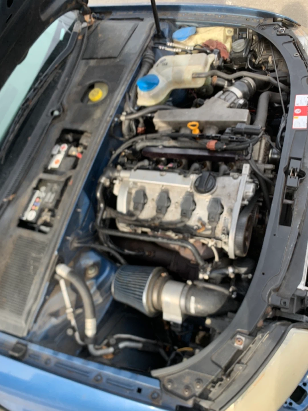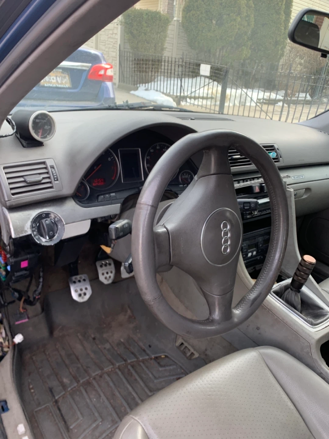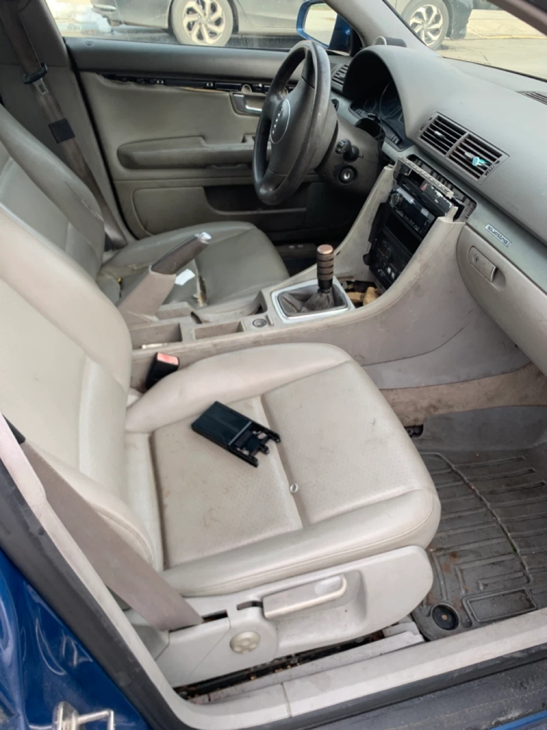 This is a blue Audi A4 sedan with a manual transmission. It has leather interior and white aftermarket wheels. The engine bay shows aftermarket modifications. B6 02 1.8t 5spd manual