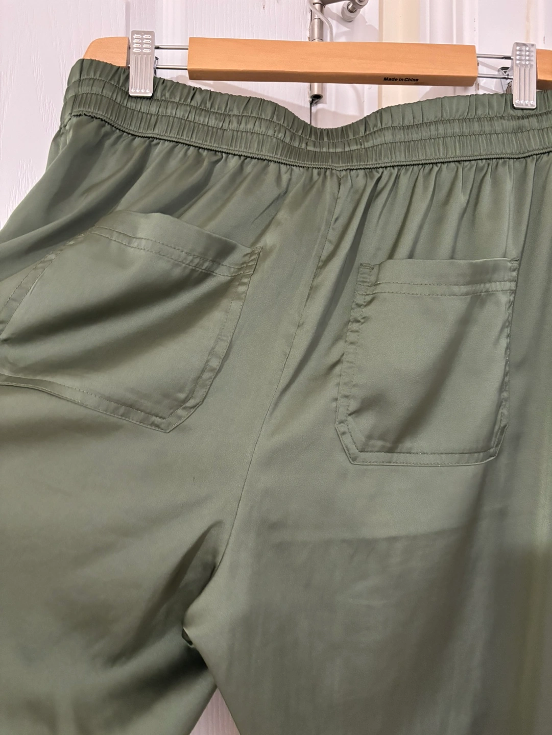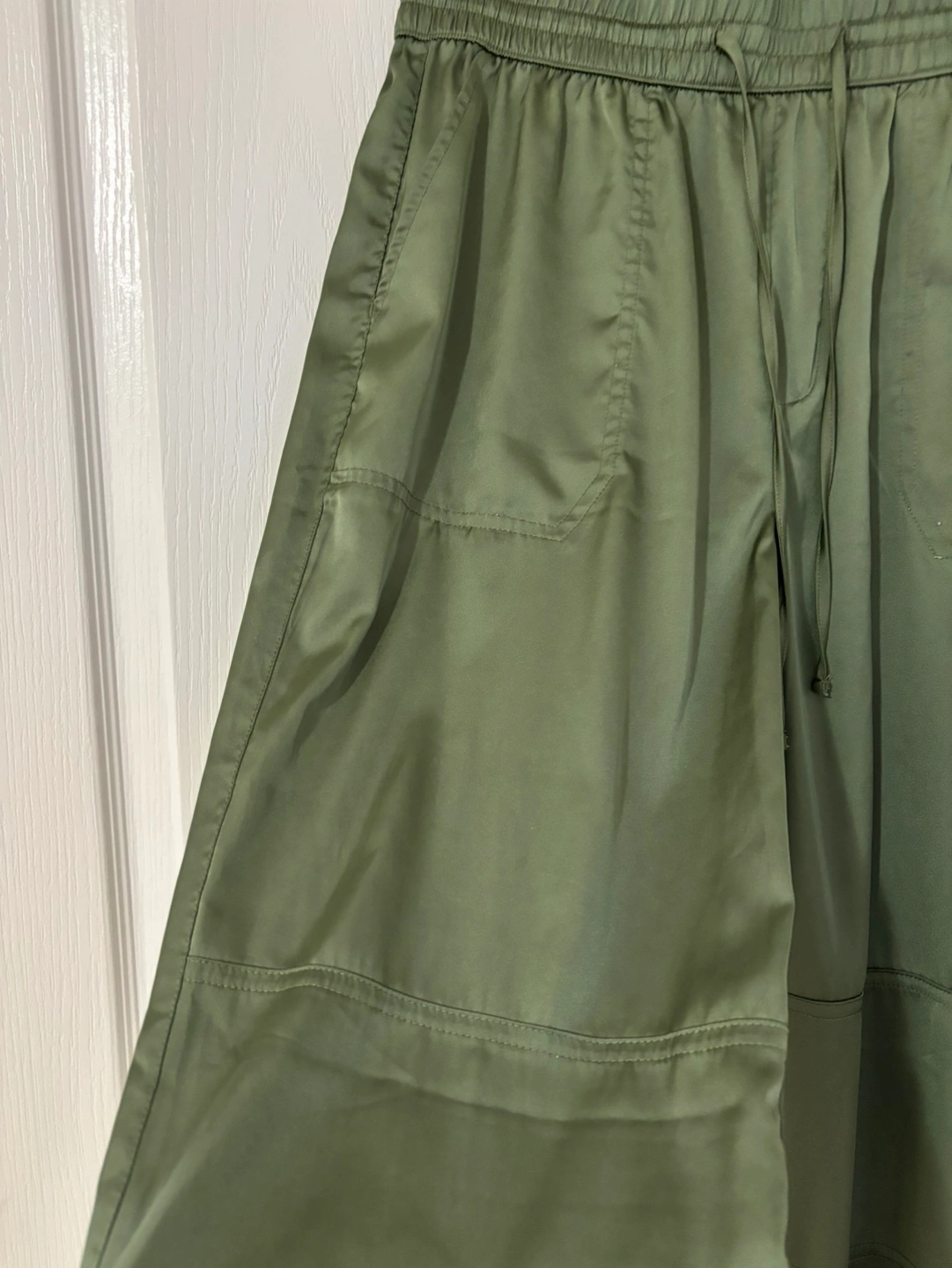 Green satin pants, size medium. They have a high waist with a drawstring closure. There are pockets on the sides and back.