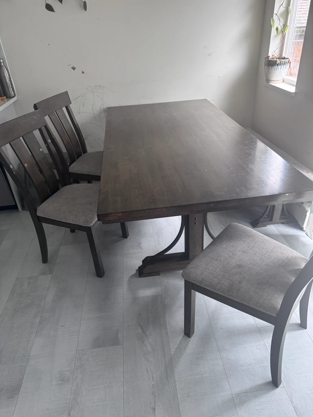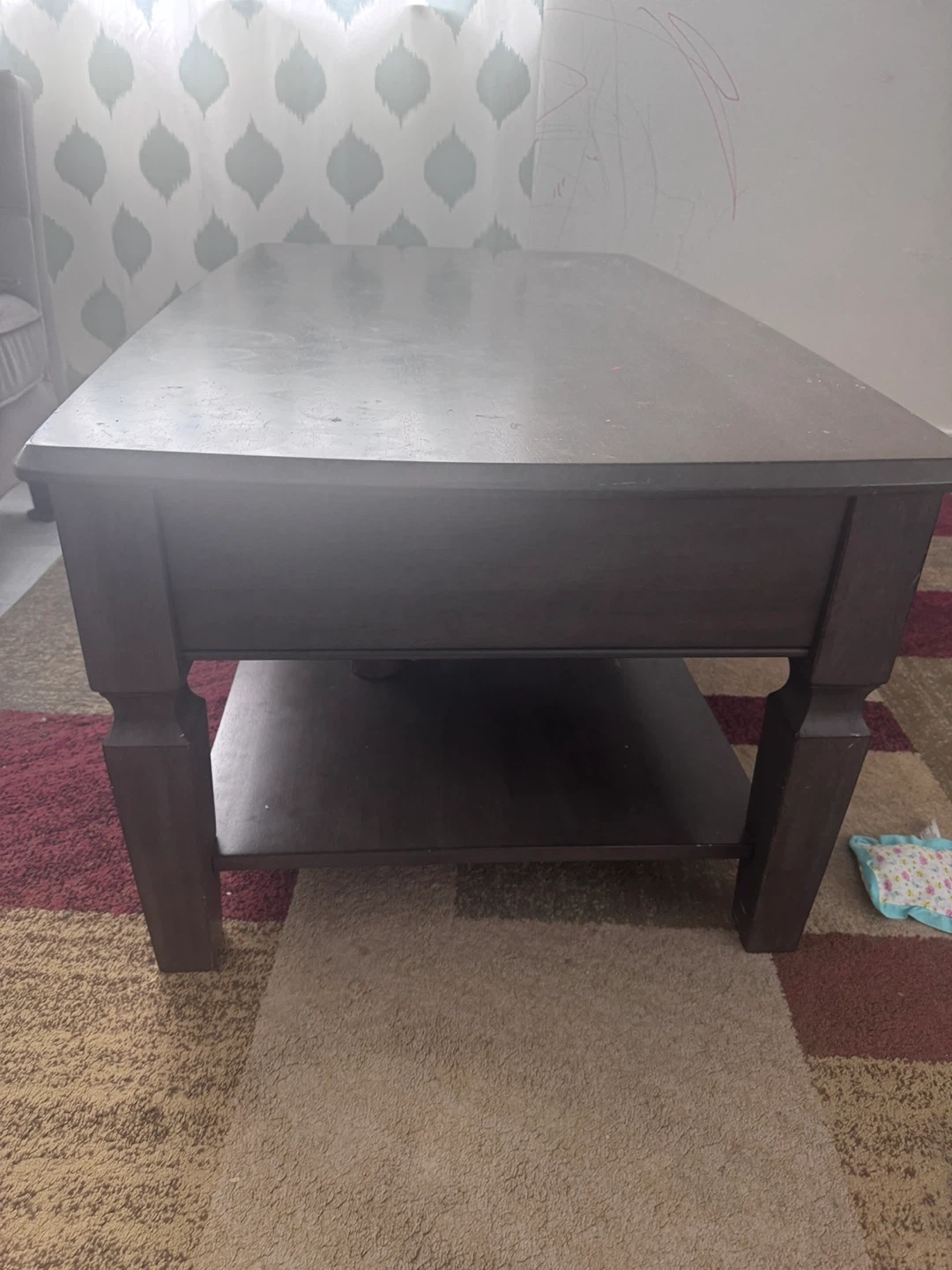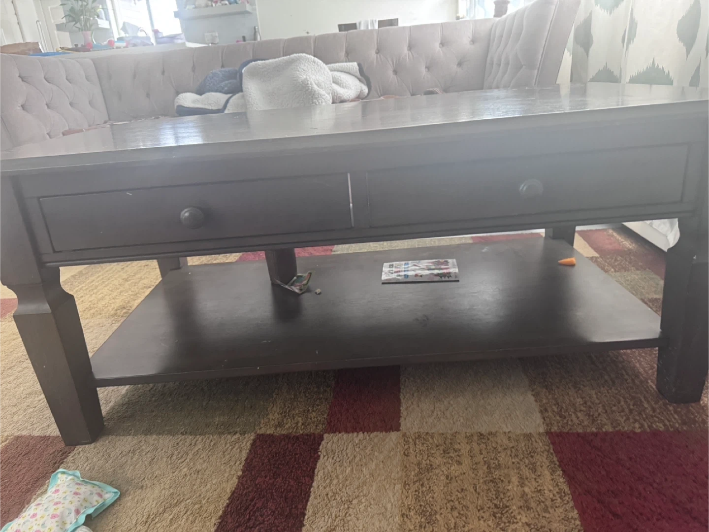 A set featuring a dark wood dining table and a matching coffee table. The dining table is accompanied by upholstered chairs and a bench, providing ample seating. The coffee table includes two drawers for storage. This set offers a cohesive look for your dining and living spaces.