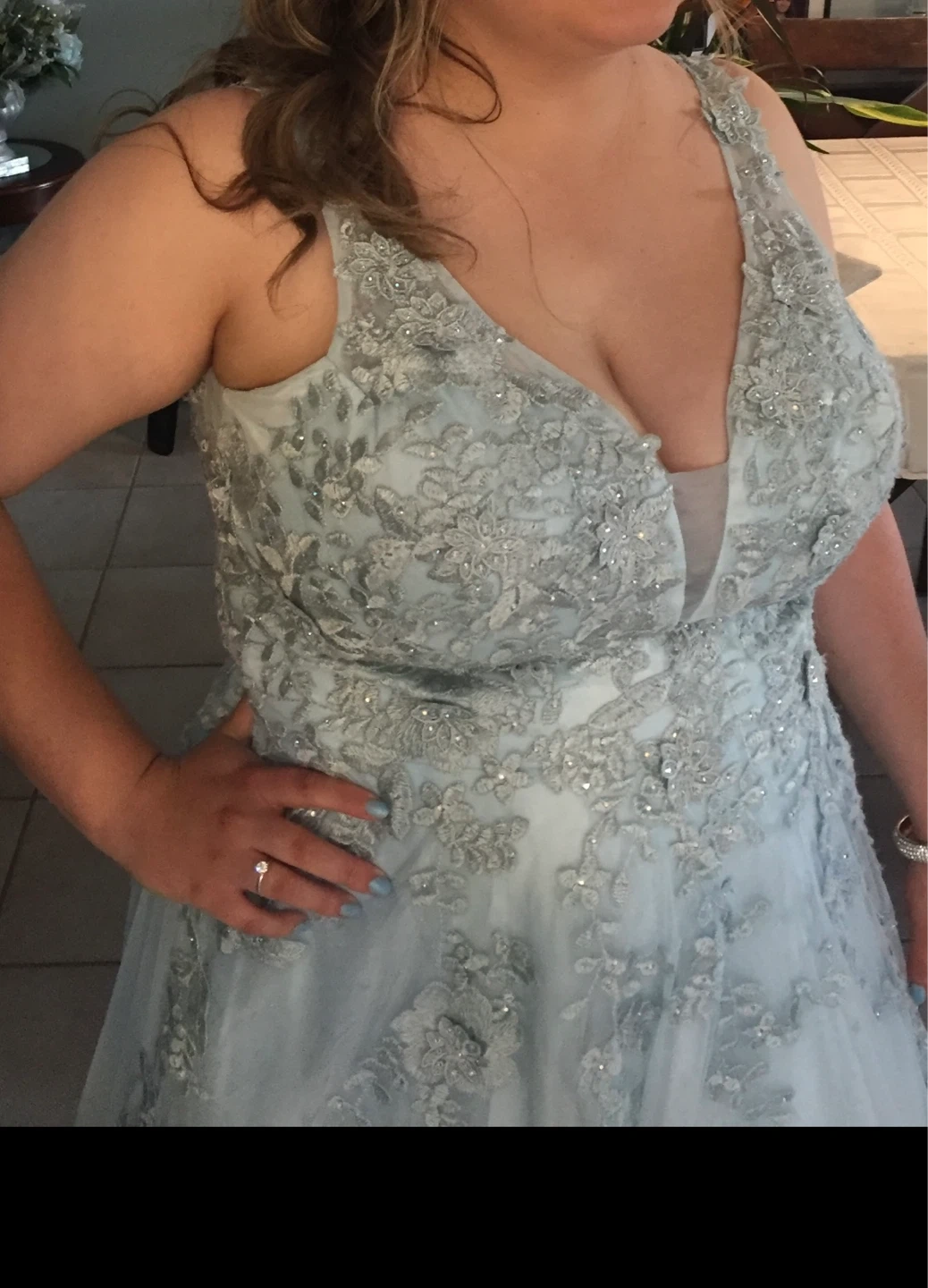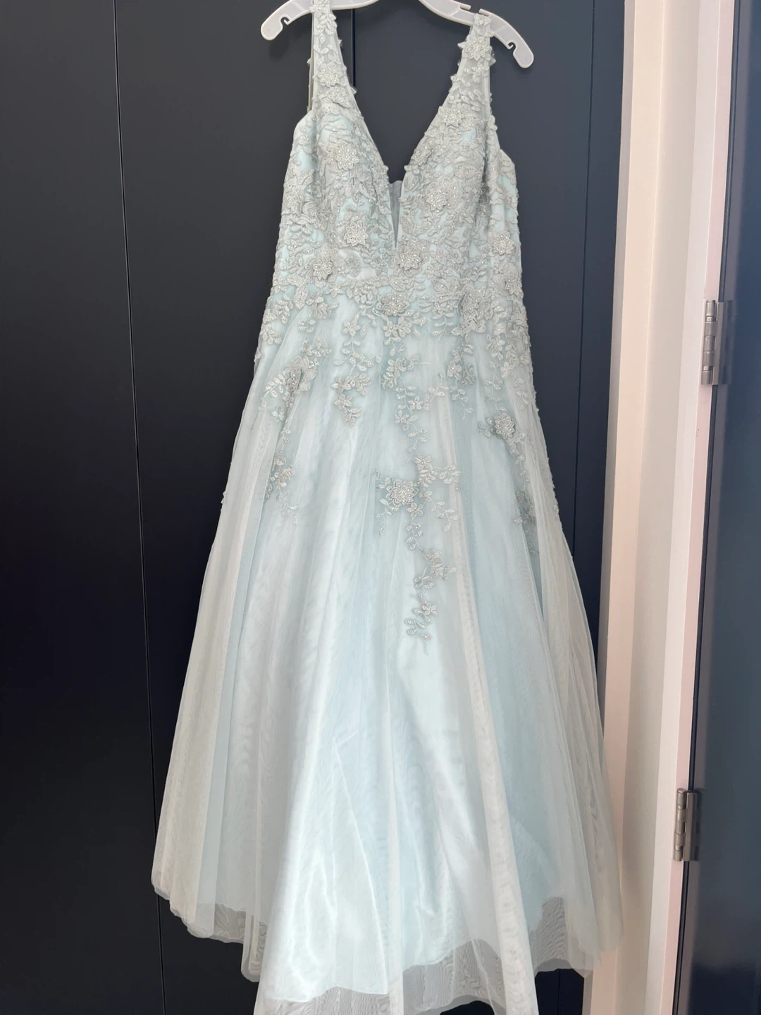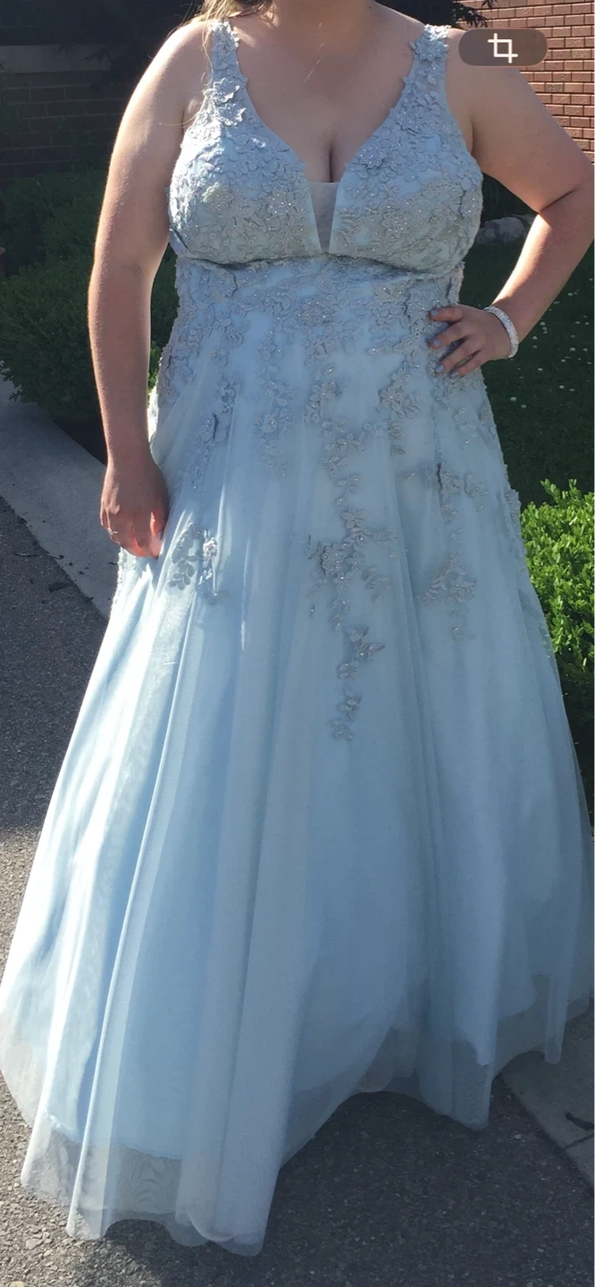 This beautiful light blue V-neck gown features intricate lace applique and sparkling embellishments. It's a sleeveless design with a full, flowing skirt, perfect for that special occasion Size 20 only worn once for four hours. Smoke free home.