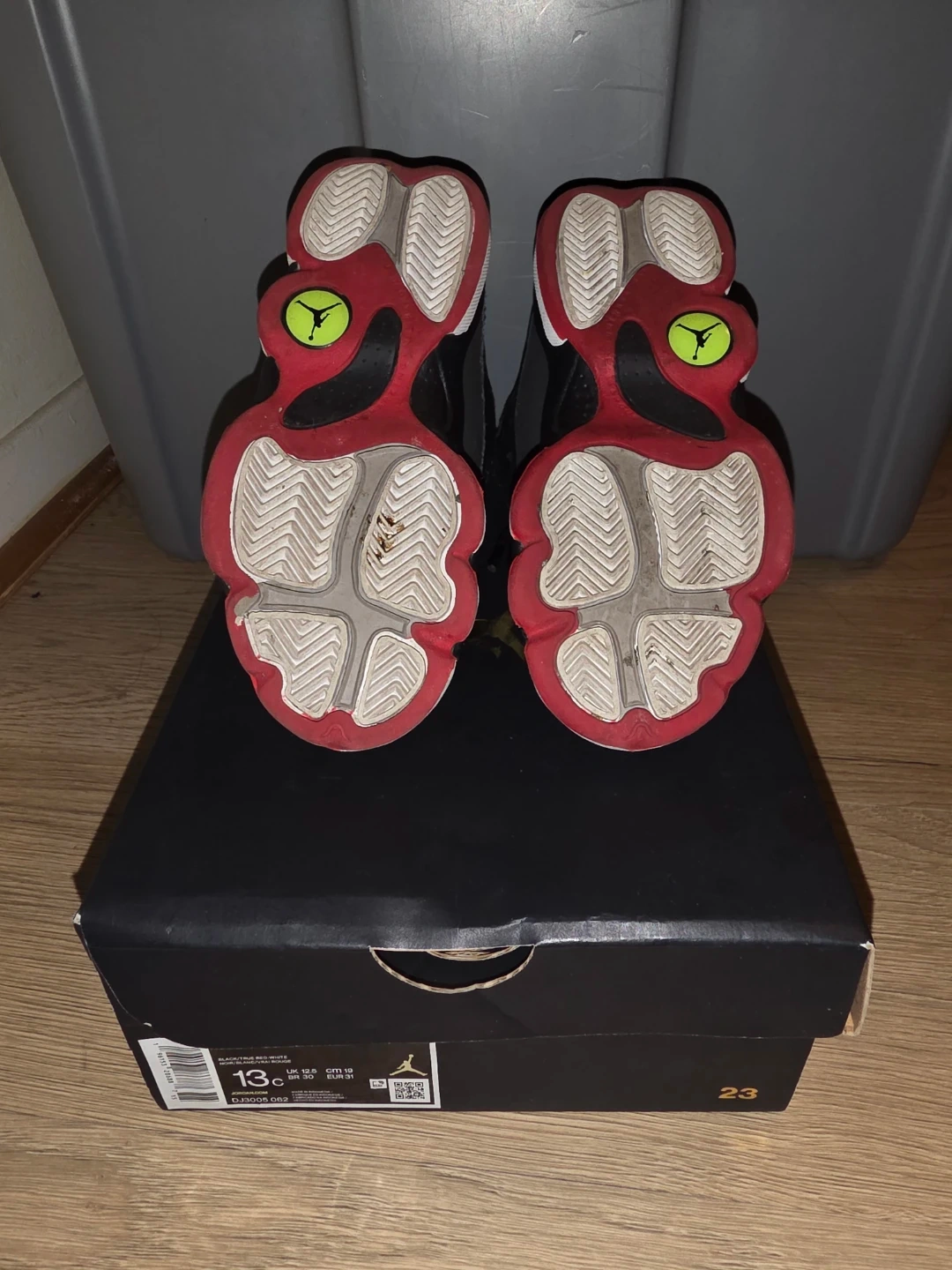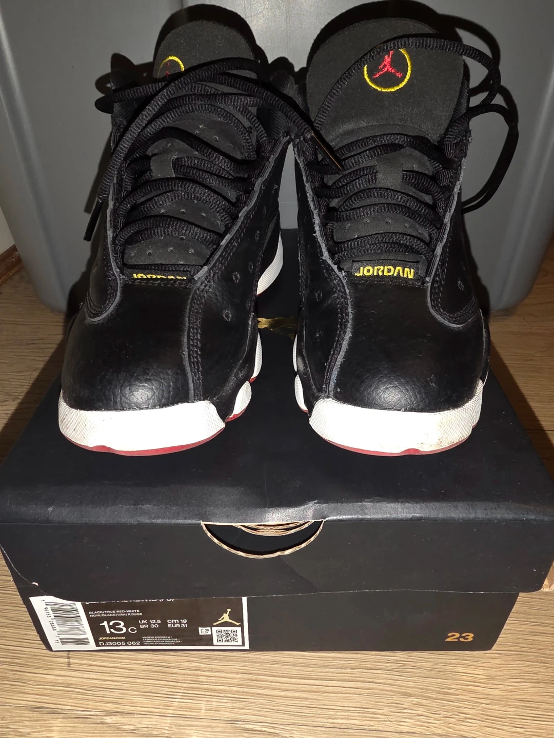 Selling a pair of Jordan 13 Retro (PS) in black and true red. They are size 13C and come with the original box. Great for your little one!