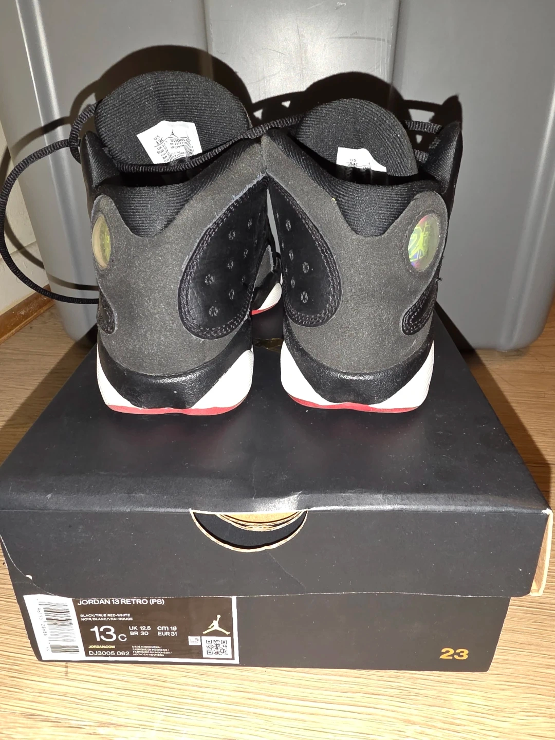 Selling a pair of Jordan 13 Retro (PS) in black and true red. They are size 13C and come with the original box. Great for your little one!
