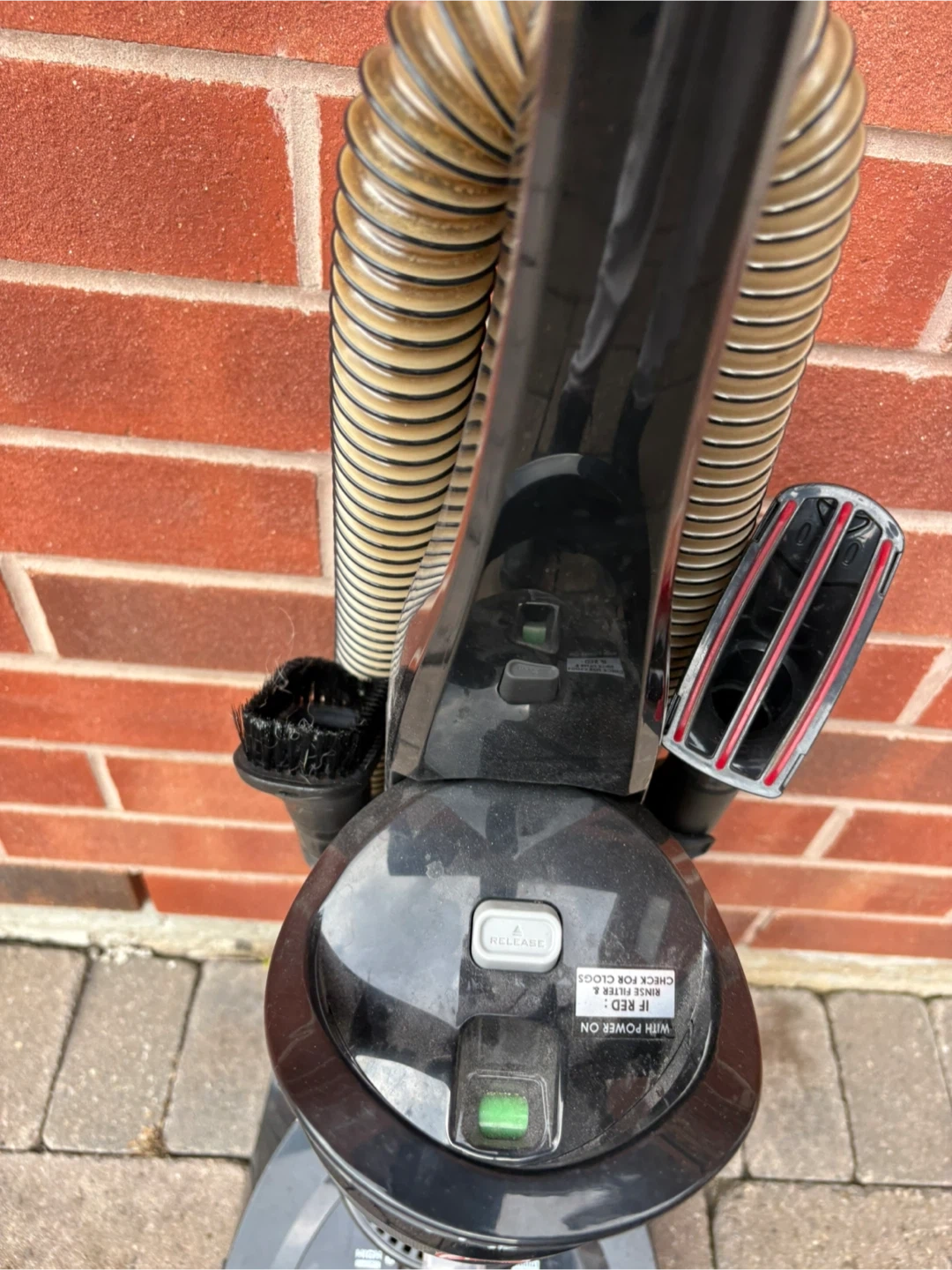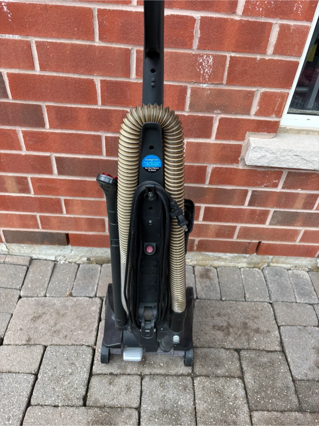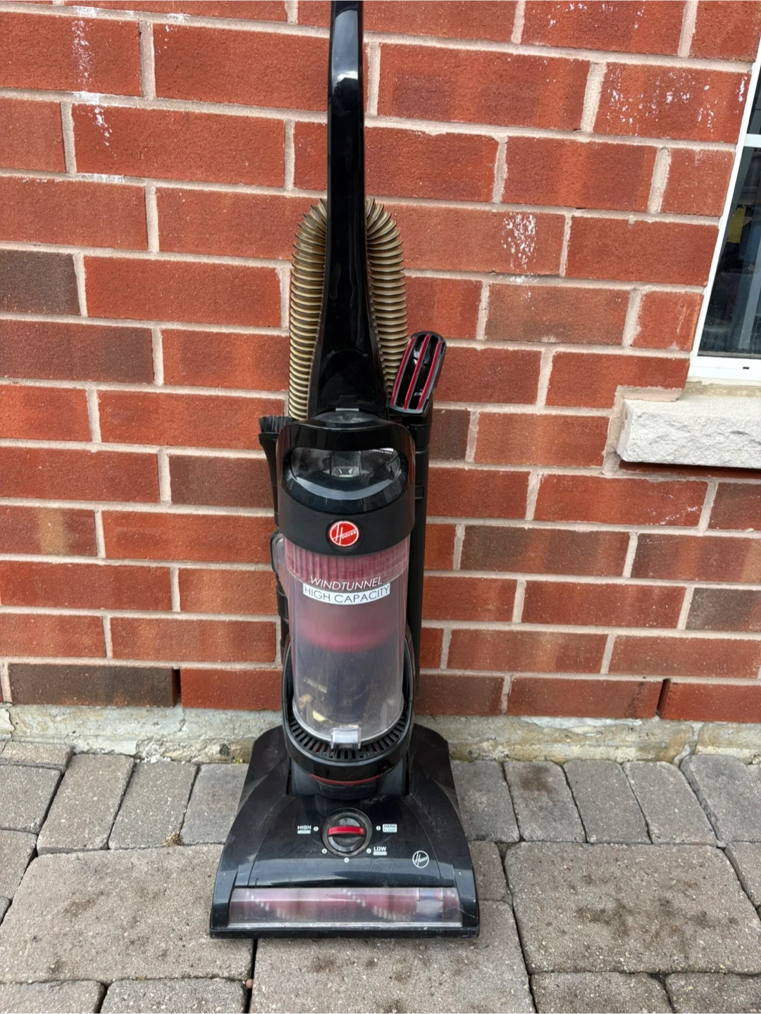 This is a Hoover WindTunnel upright vacuum cleaner with high capacity. It's black and features a clear dirt canister. Settings include high and low pile carpet modes.