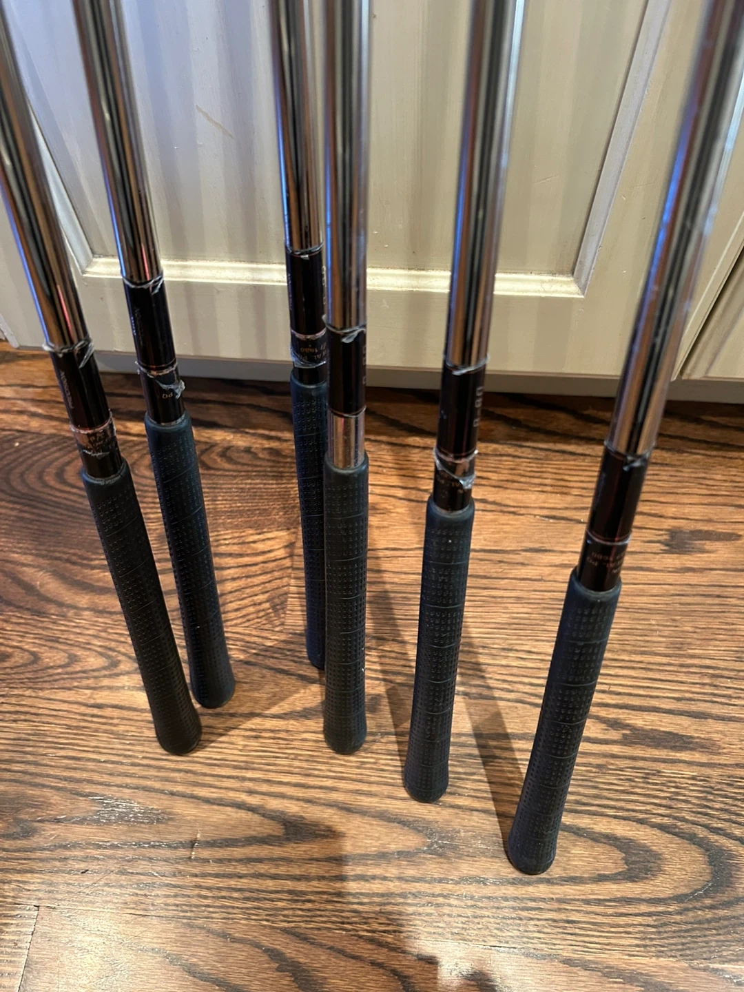 Selling a TaylorMade SuperSteel Burner iron set. Includes irons numbered 5, 6, 7, 8, 9, D, and P. The grips are black. They are in used condition but still have a lot of life left in them