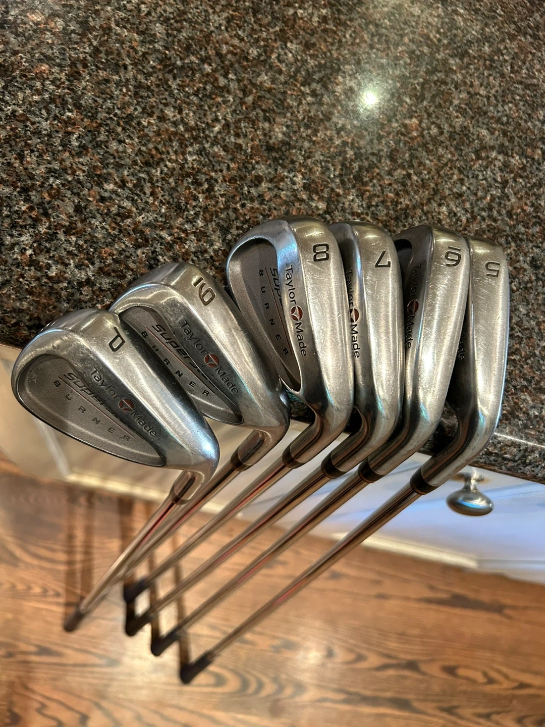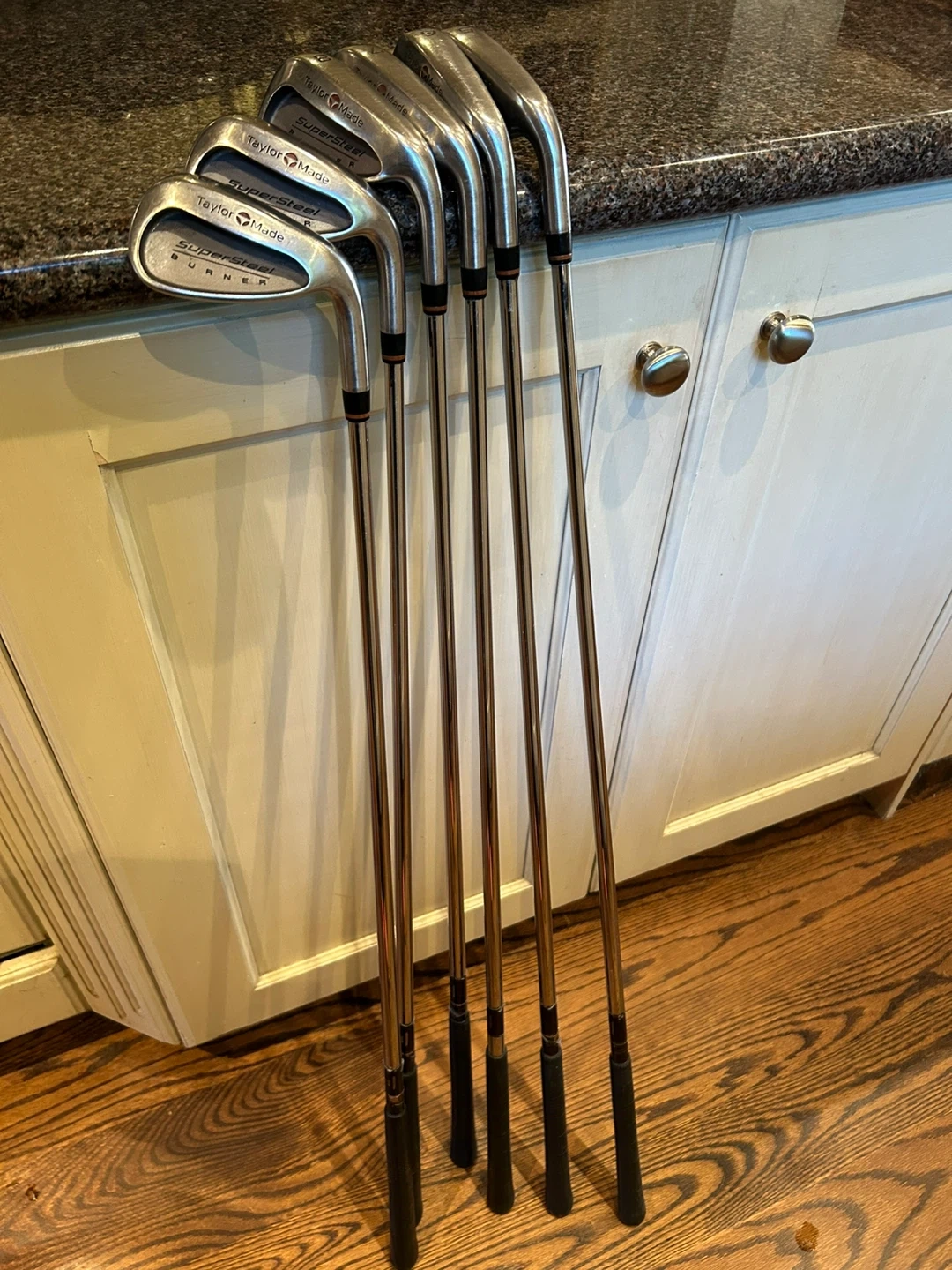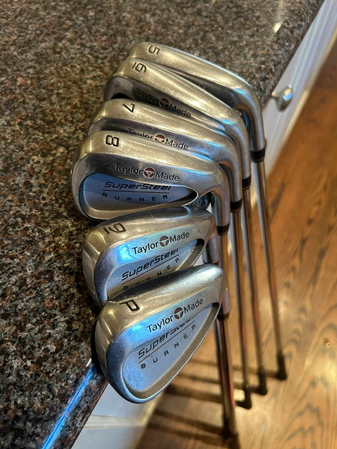 Selling a TaylorMade SuperSteel Burner iron set. Includes irons numbered 5, 6, 7, 8, 9, D, and P. The grips are black. They are in used condition but still have a lot of life left in them