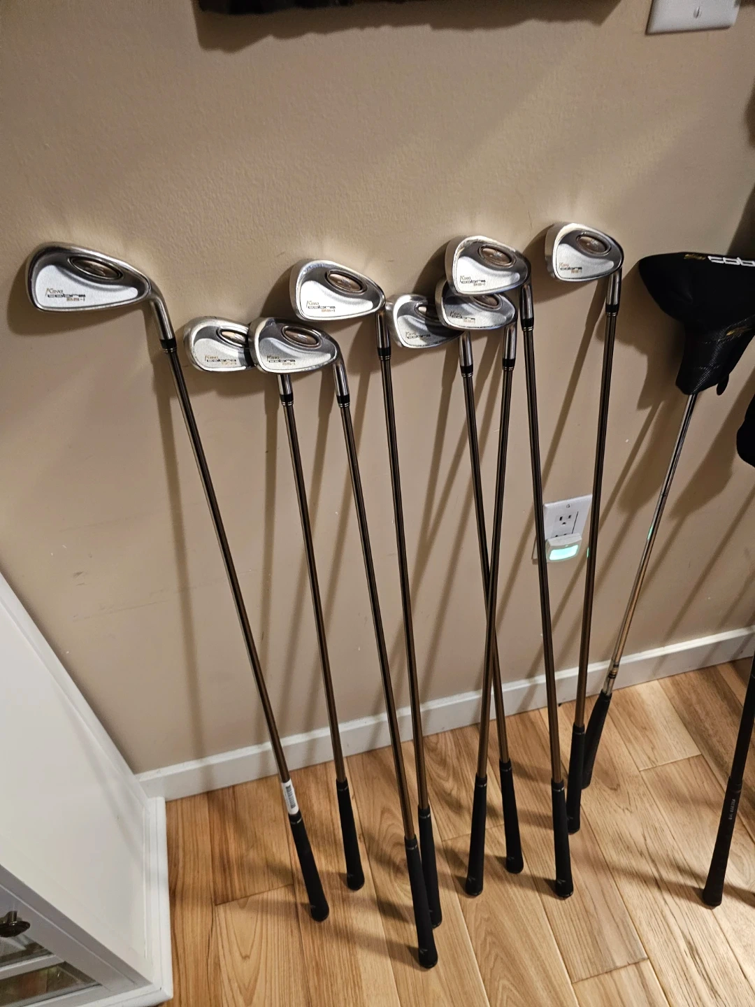 This is a set of right-handed Cobra golf irons and a driver.