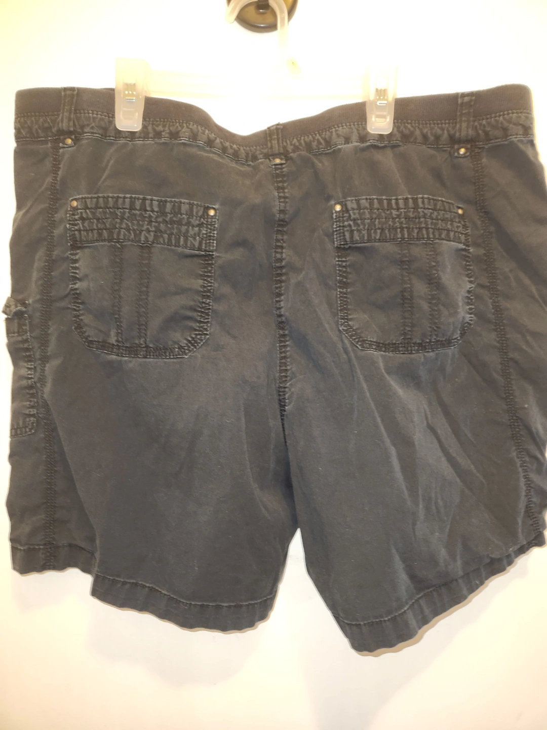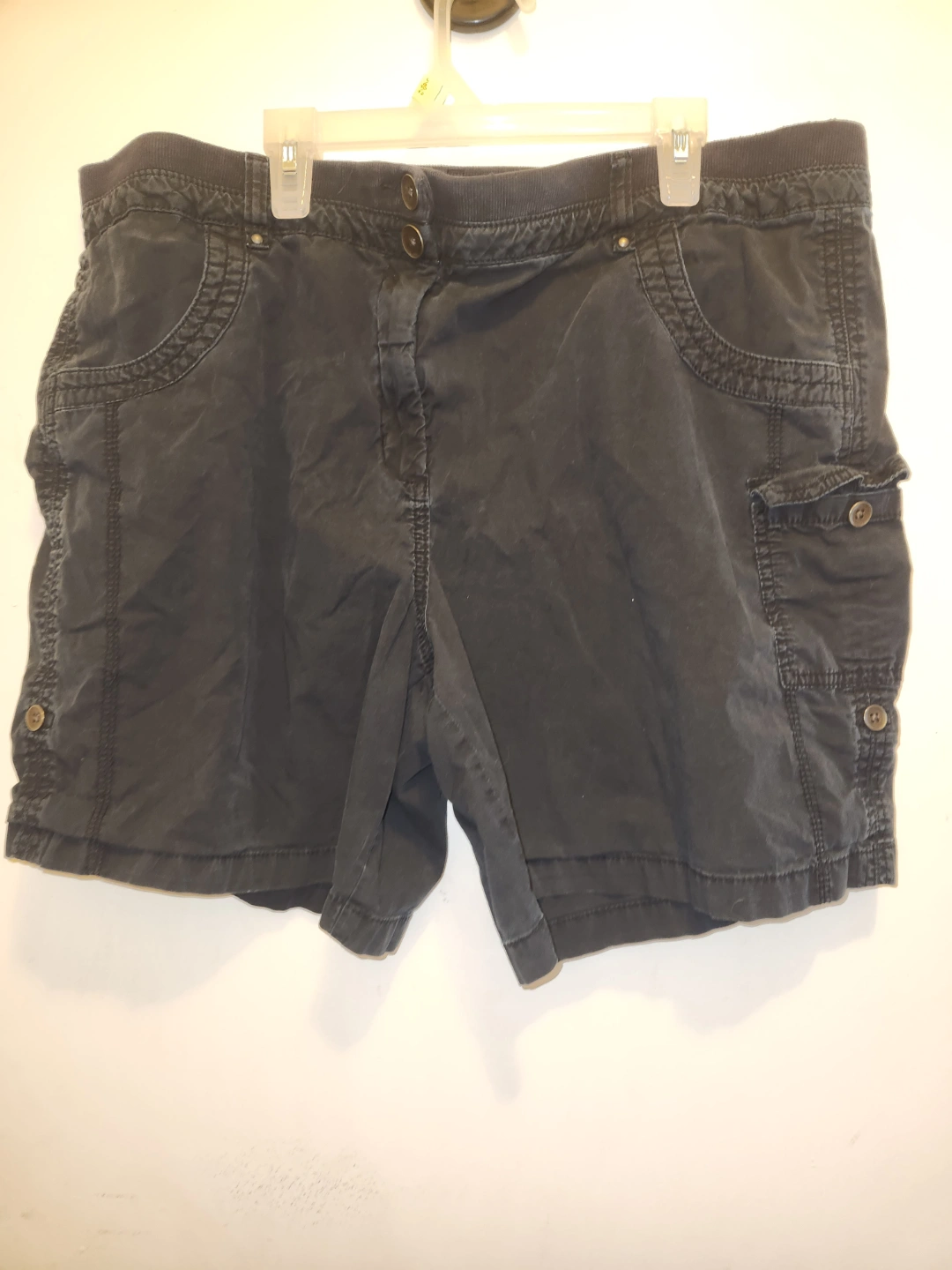 Women's black cargo shorts. Size 18 Multiple pockets. Button and zipper closure. Elastic waistband. Good used condition.