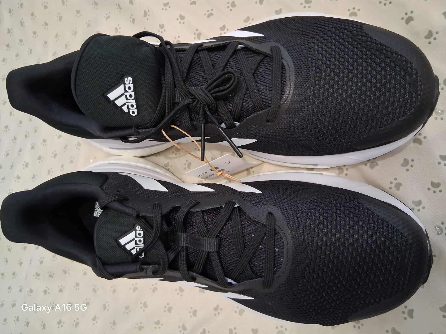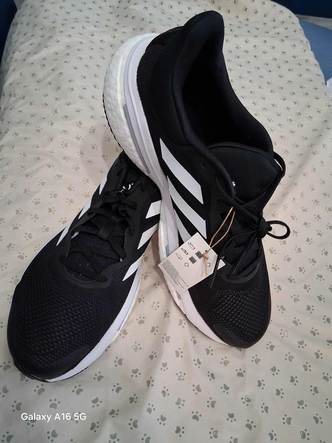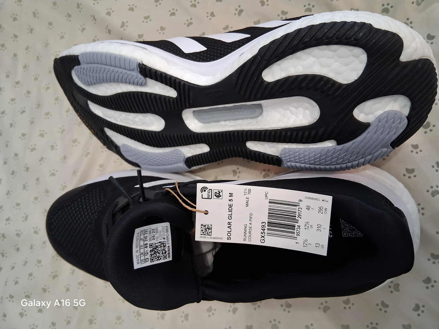 Selling a pair of Adidas Solar Glide 5 M running shoes in black and white. These are size 13 in men's. The shoes are designed for running and course road. They feature Adidas Jet technology for a comfortable stride.