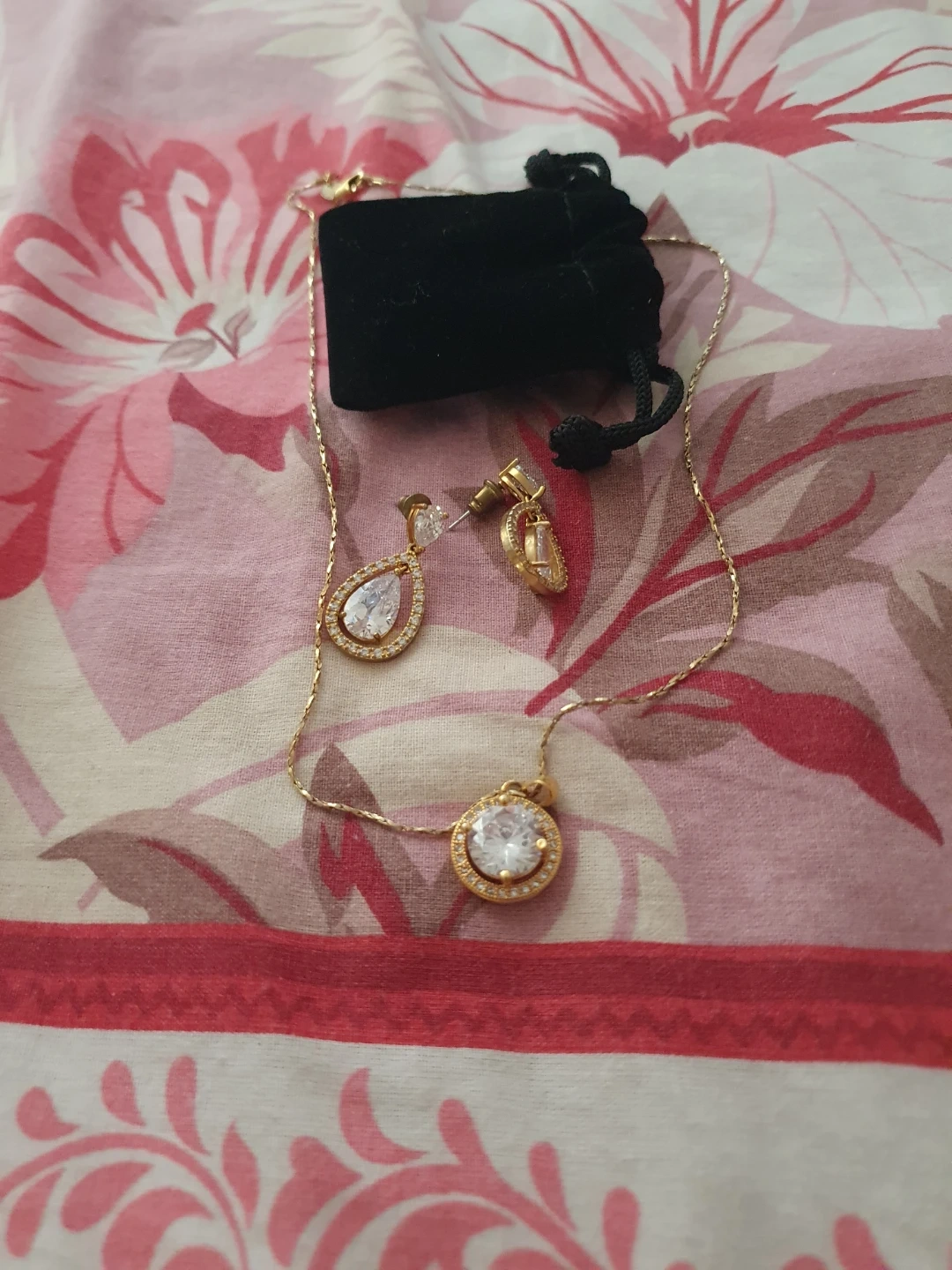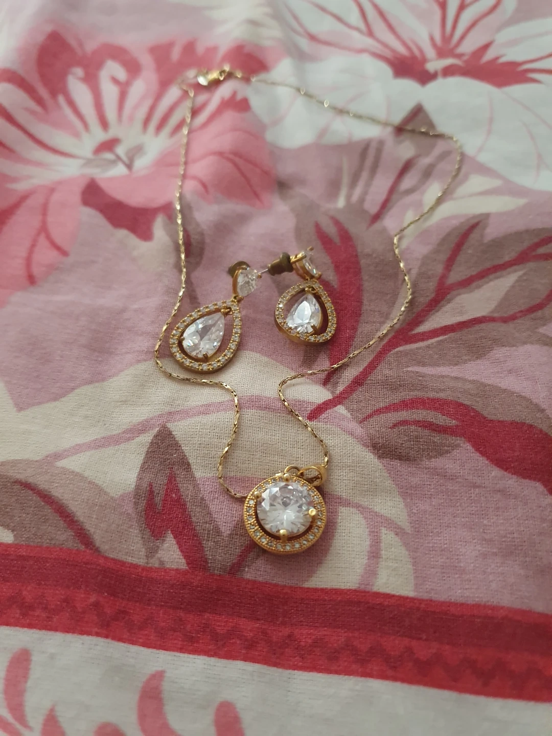 This set includes a gold-tone necklace with a round pendant and a pair of matching teardrop earrings. Both pieces are adorned with clear crystals and come with a black velvet pouch.