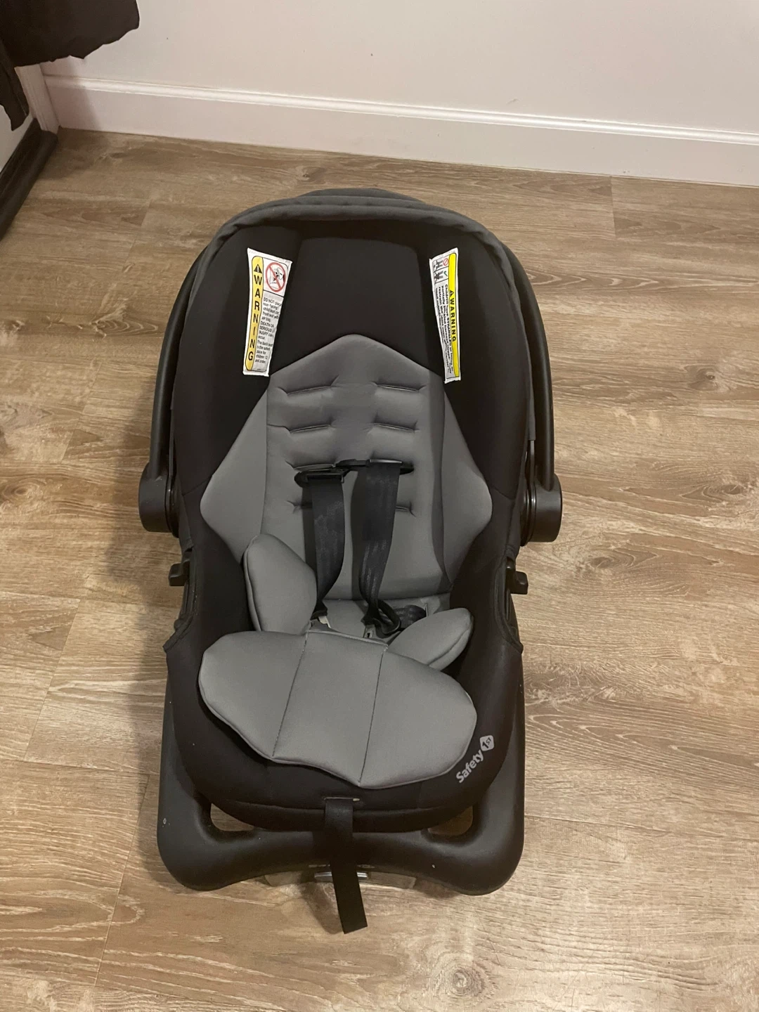 This is a Safety 1st infant car seat in black and grey. It features a 5-point harness for secure seating. It's suitable for infants and comes with a base.