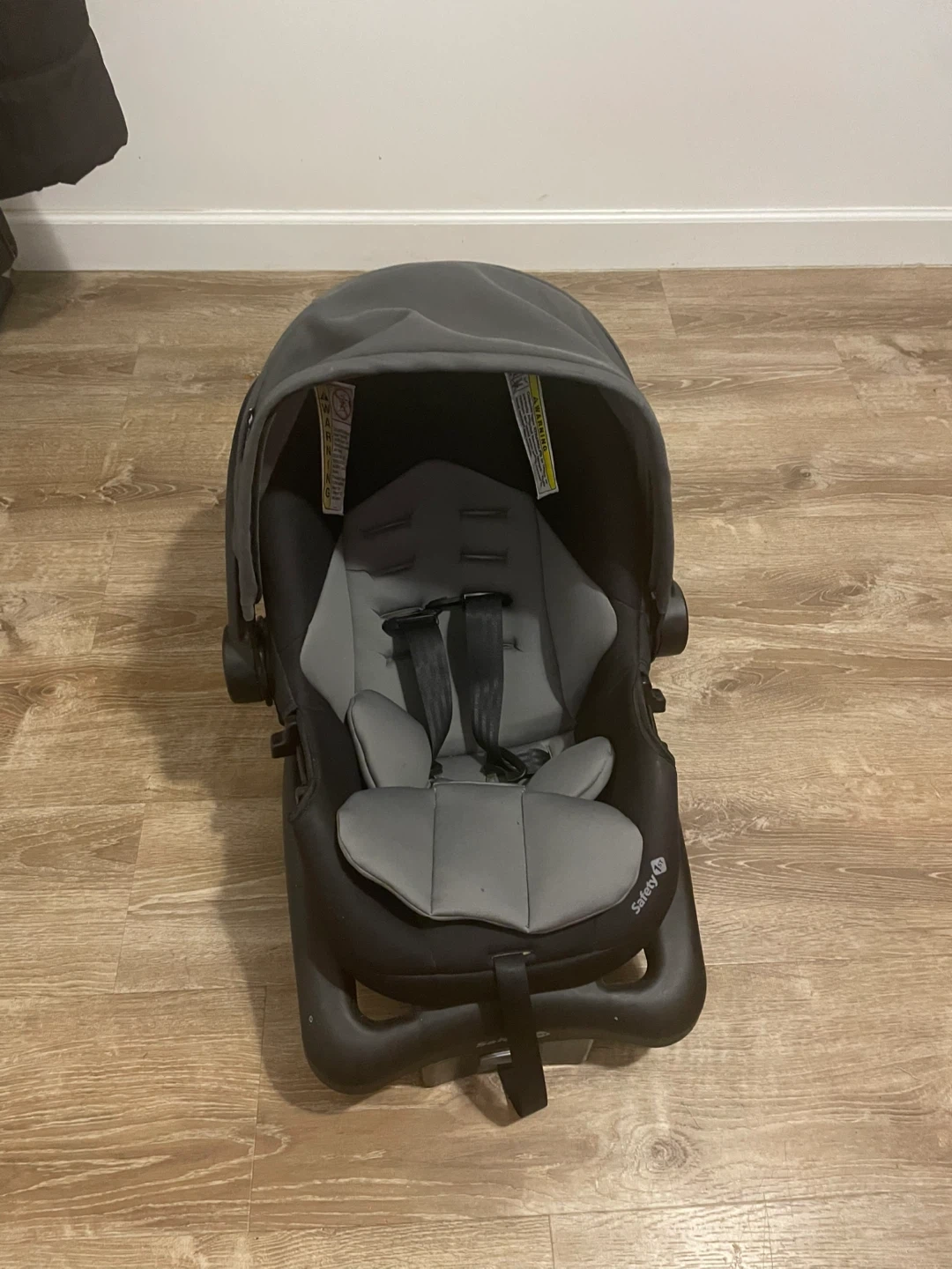 This is a Safety 1st infant car seat in black and grey. It features a 5-point harness for secure seating. It's suitable for infants and comes with a base.